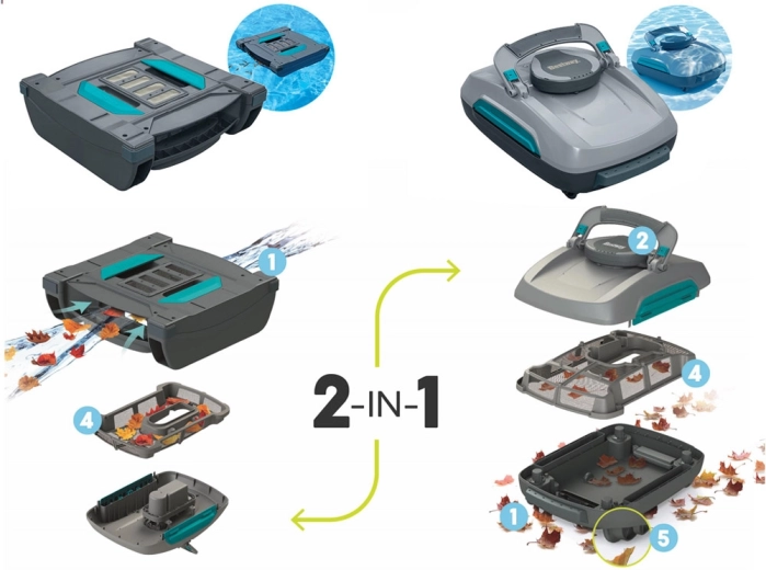 Chytré vodní senzory aktivují robot po ponoření a vypnou jej po vyjmutí z vody, čímž chrání motor. Rychlé nabíjení 3–4 hodiny a bezdrátová konstrukce dávají naprostou volnost pohybu. Koše s velkým objemem zachytí listí, písek i hmyz a snadno se čistí shora přístupným filtrem.