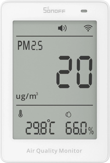 Kompaktní monitor kvality vzduchu Sonoff AirGuard poskytuje přesné měření PM2.5 a PM10, teploty a vlhkosti v reálném čase. Díky Wi‑Fi připojení, integraci se standardem Matter a přehlednému 3,73" LCD displeji snadno sledujete podmínky doma i v kanceláři. Nechybí historie dat až na 1 rok, chytrá upozornění, zvukové i vizuální alarmy a pohodlné ovládání přes aplikaci či hlasem.