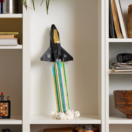 Důmyslné detaily potěší každého stavitele: otevírací kokpit, odnímatelný podvozek i dva kosmické helmy se zlatými štíty. Raketoplán lze snadno vystavit v dynamické „launch“ póze díky pevné základně s efektem tahu motorů – perfektní dekorace na poličku či stůl.