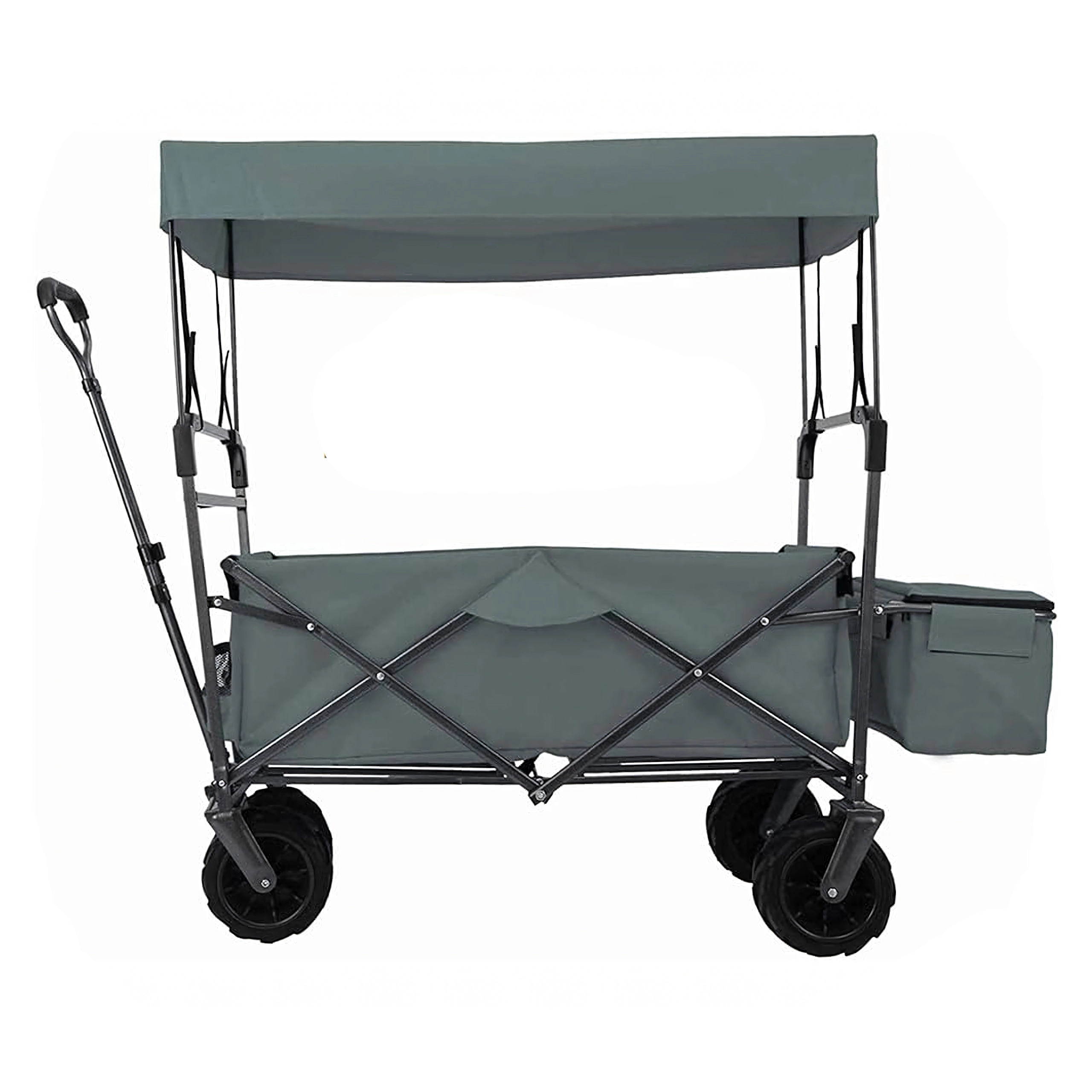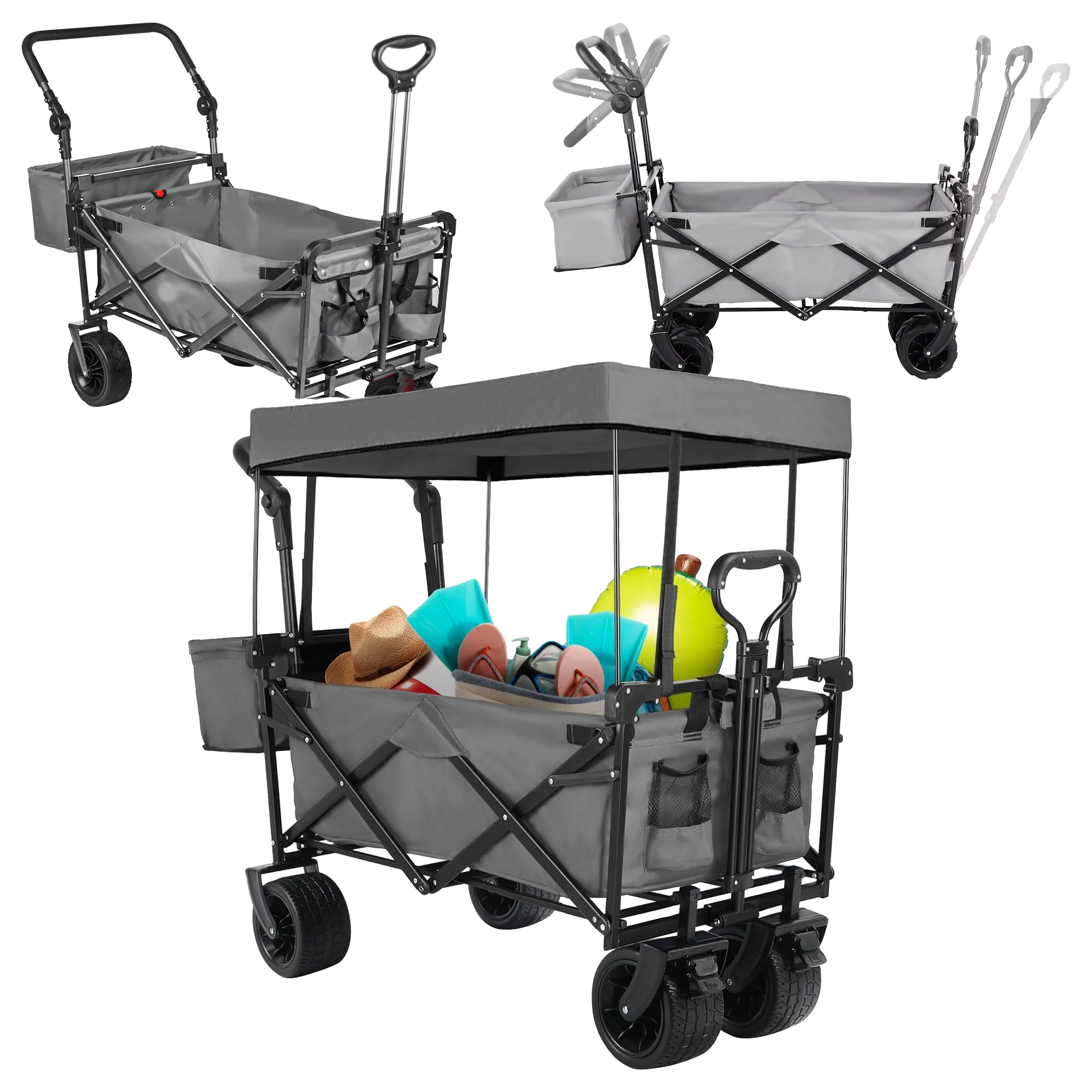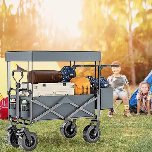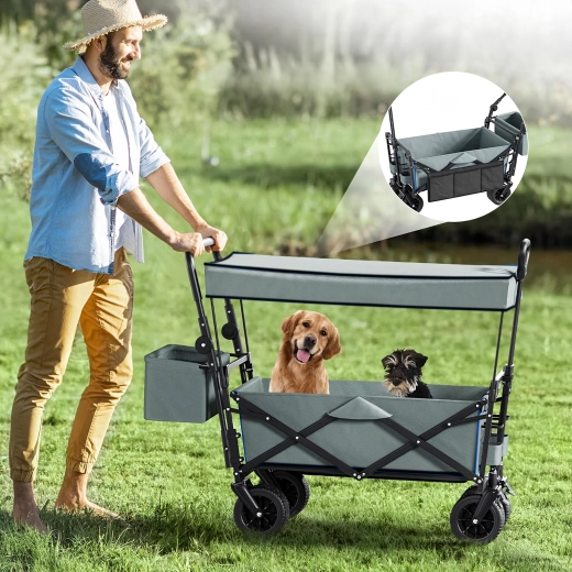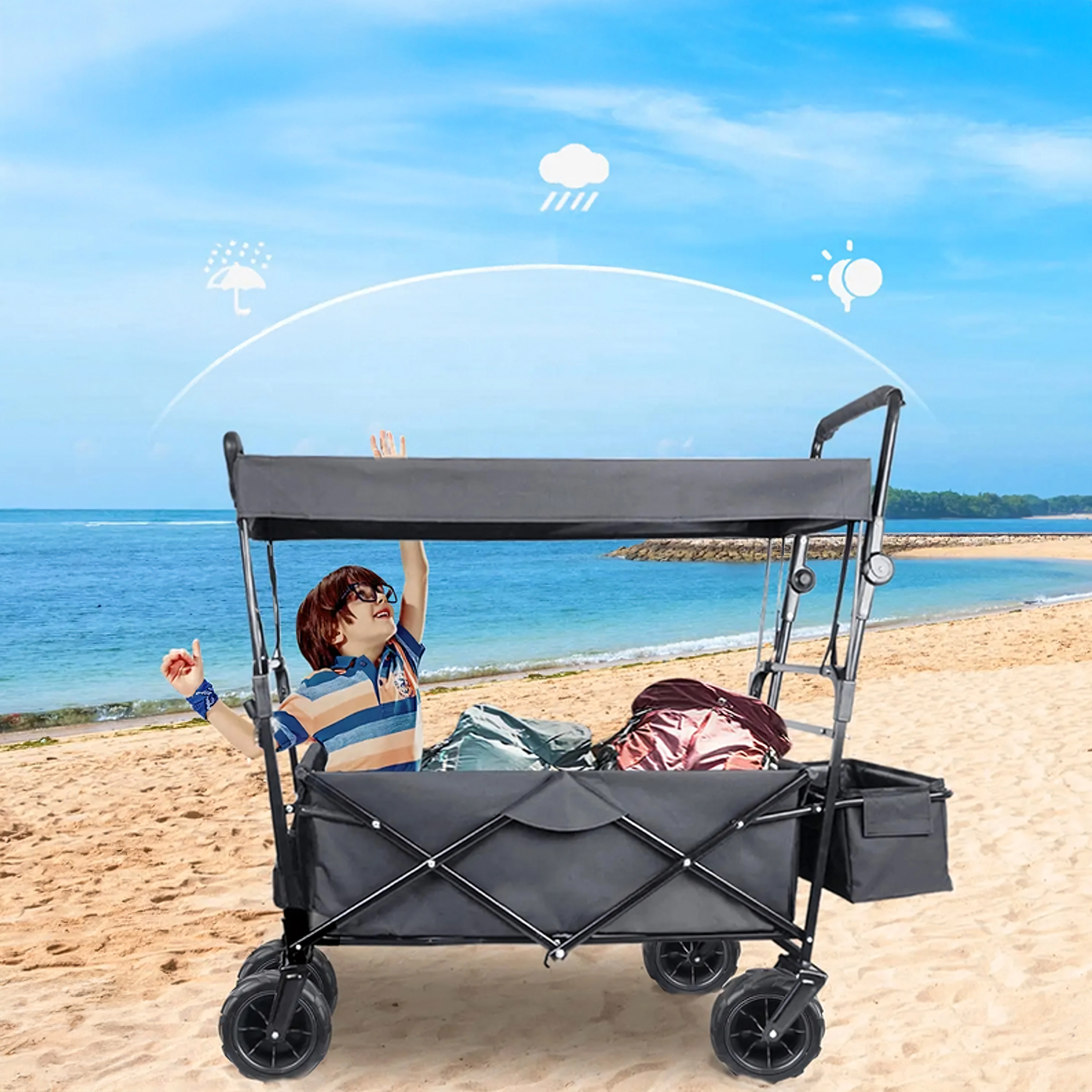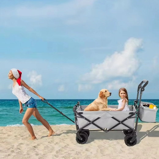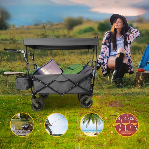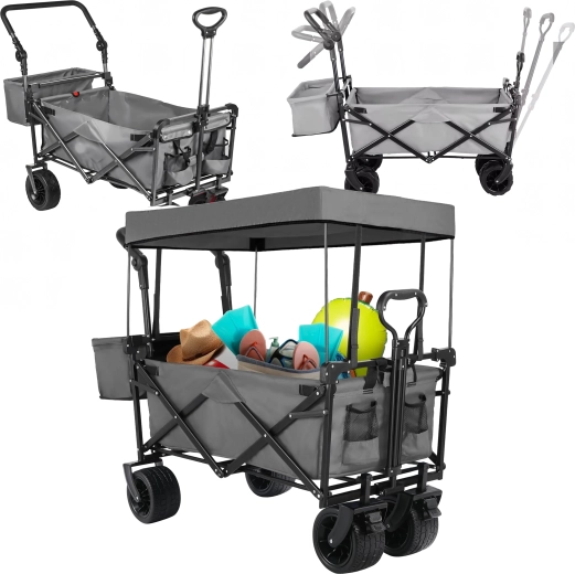 Univerzální skládací vozík je ideální pomocník na zahradu, pláž, kempování i rybaření. Robustní konstrukce s pevnou textilní korbou zvládne nářadí, nákupy, sportovní výbavu i plážové doplňky. Díky kolům XL se snadno pohybuje po písku, trávě i štěrku, zatímco stříška poskytuje stín a ochranu před sluncem.