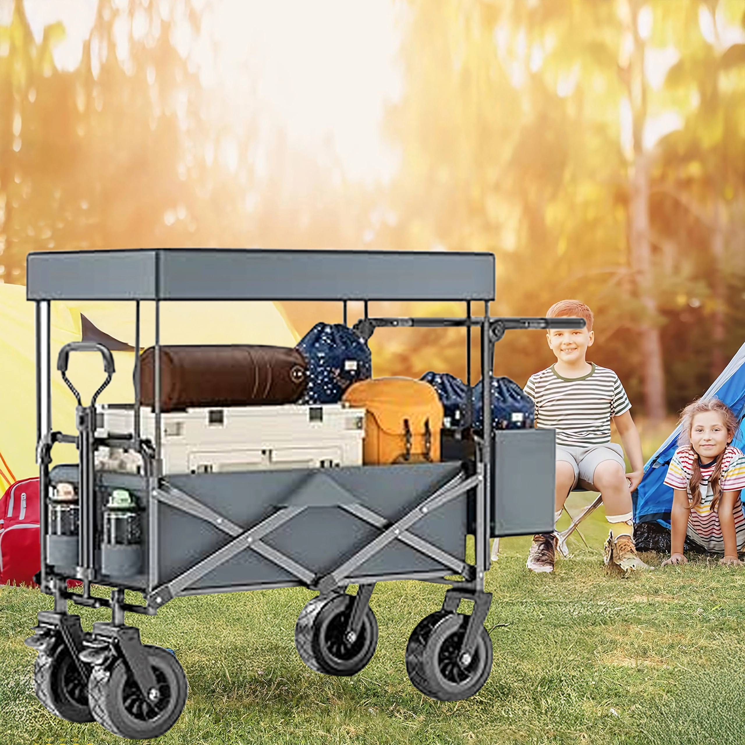 Odnímatelná kopule chrání obsah před sluncem a lehkým větrem – praktické při převážení dětí, domácích mazlíčků i kempingové výbavy.