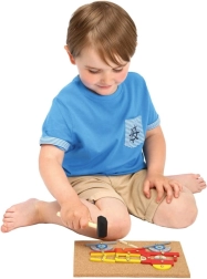 Děti přikládají dílky a jemně je přitloukají kladívkem. Hra posiluje koordinaci oko–ruka, trpělivost a přesnost.