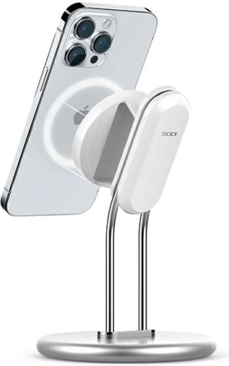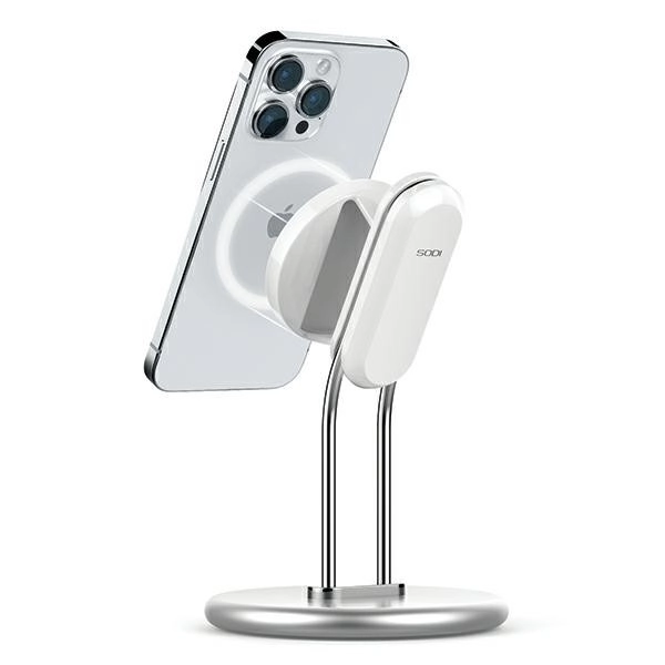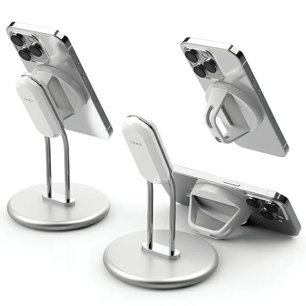 Elegantní magnetický stojánek z hliníkové slitiny s odnímatelným držákem nabízí pevnou stabilitu, kompatibilitu s MagSafe a pohodlné hands‑free sledování videí, her i videohovorů. Měkké silikonové podložky chrání stůl, nastavitelný úhel zajišťuje skvělé pozorovací úhly a vyměnitelná magnetická destička umožní vložit originální bezdrátovou nabíječku MagSafe (není součástí balení).