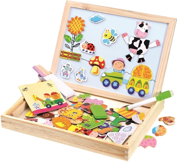 Všechny tyto kreativní nástroje a dílky jsou uloženy v dřevěné krabičce, která je lehce přenosná. Děti se s touto tabulkou na farmové téma budou bavit dlouhé hodiny a rozvíjet svou představivost a dovednosti.