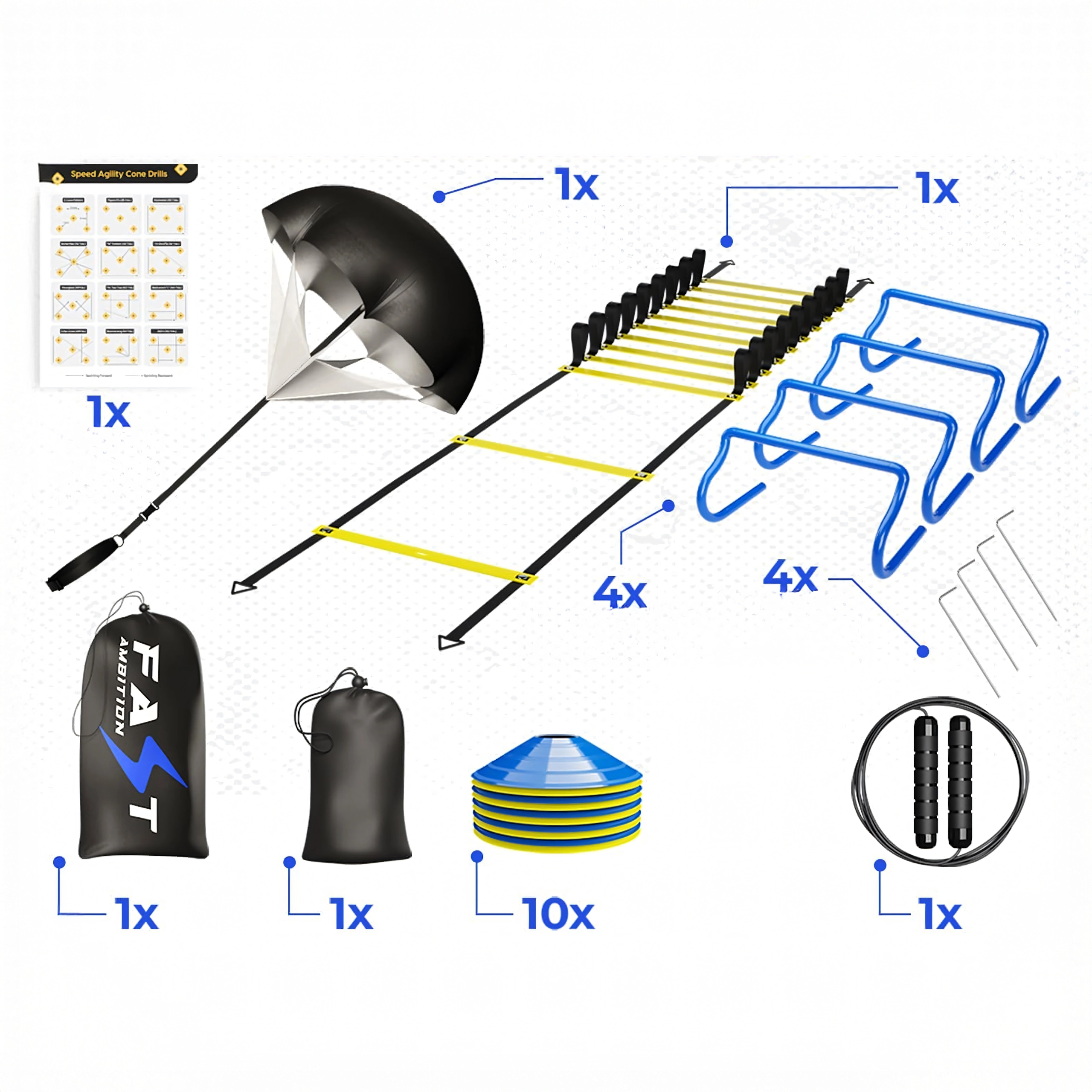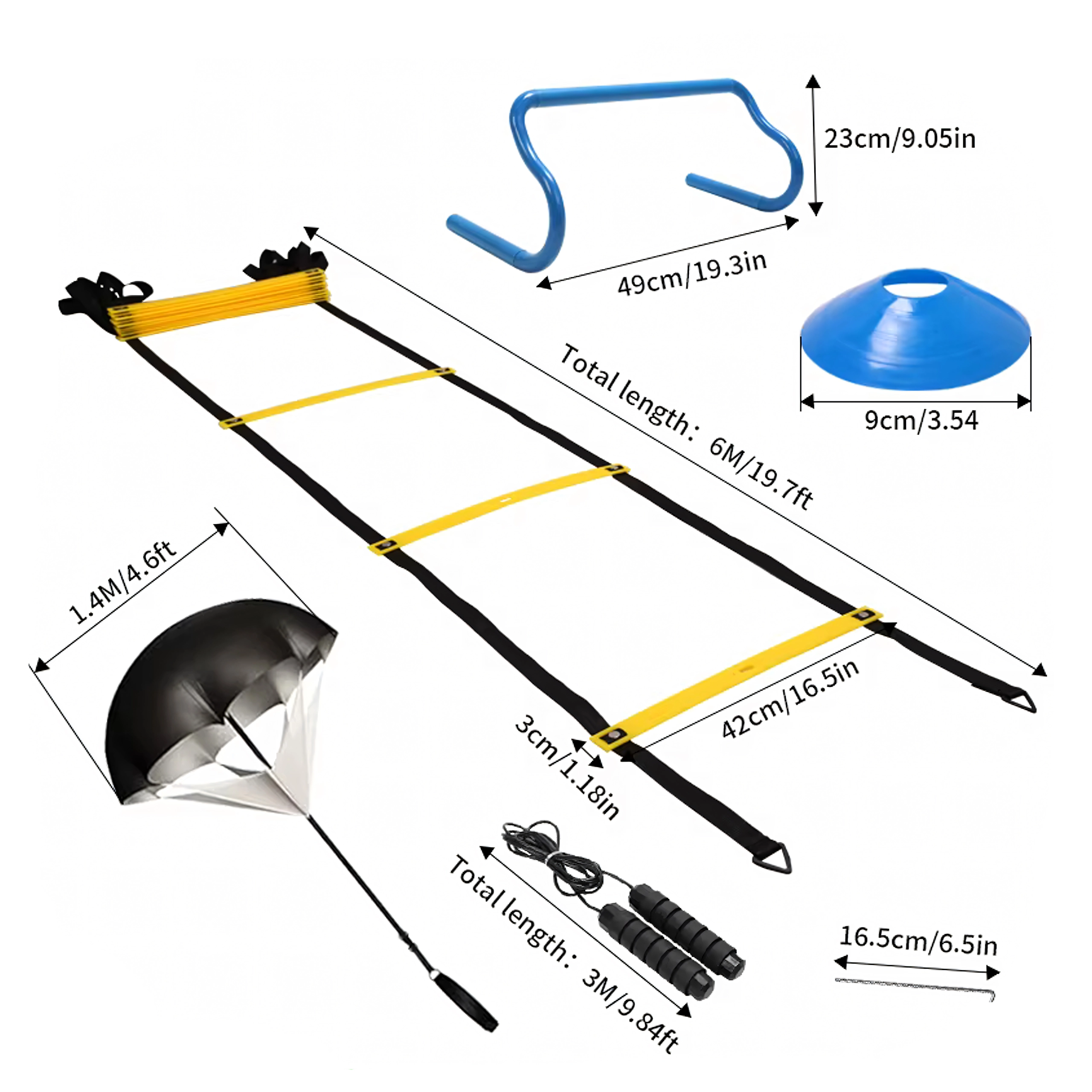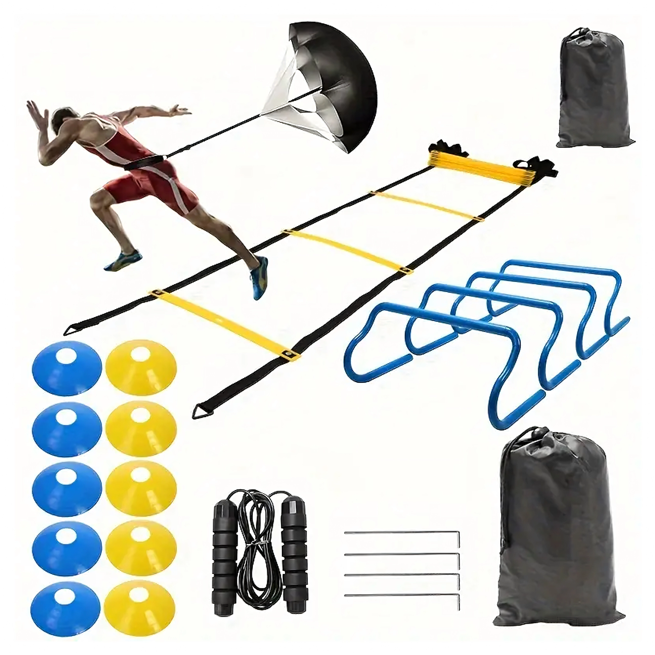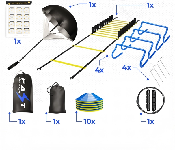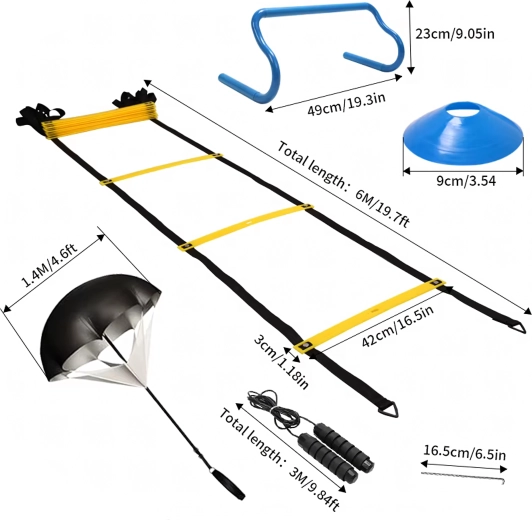 Kompletní tréninková sada pro rychlost, obratnost a koordinaci zahrnuje koordinační žebřík, minipřekážky, značkovací kužely, švihadlo, kotvící kolíky a odporový padák. Ideální pro fotbal, atletiku i domácí kondiční trénink. Díky nastavitelným příčkám, odolnému provedení a praktickým obalům je set snadno přenosný a připravený k intenzivním drilům kdekoliv.