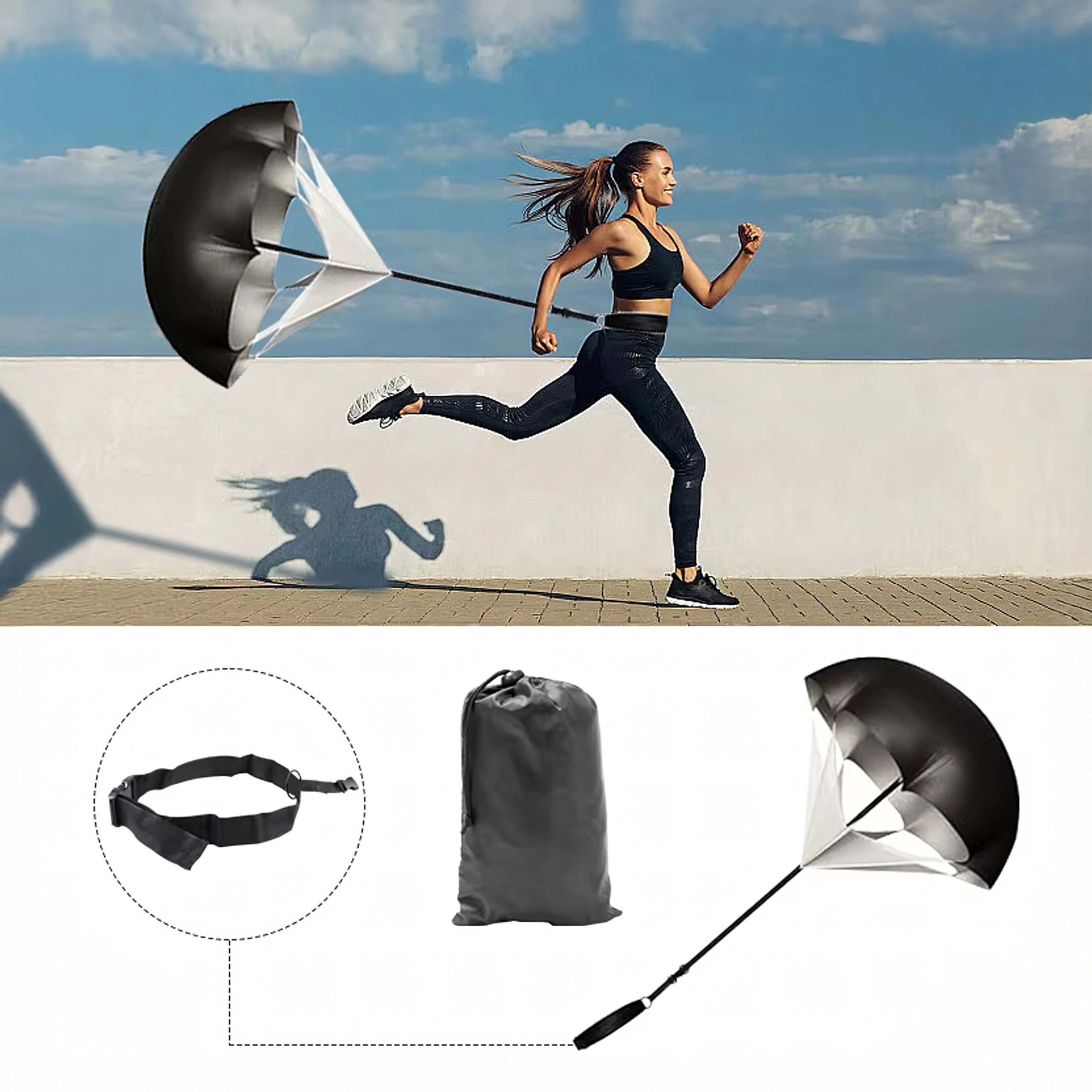 Lehká padáková zátěž zvyšuje odpor při sprintu a pomáhá rozvíjet akceleraci i maximální rychlost. Nastavitelný pás drží pevně na místě a padák se snadno složí do přiloženého vaku.