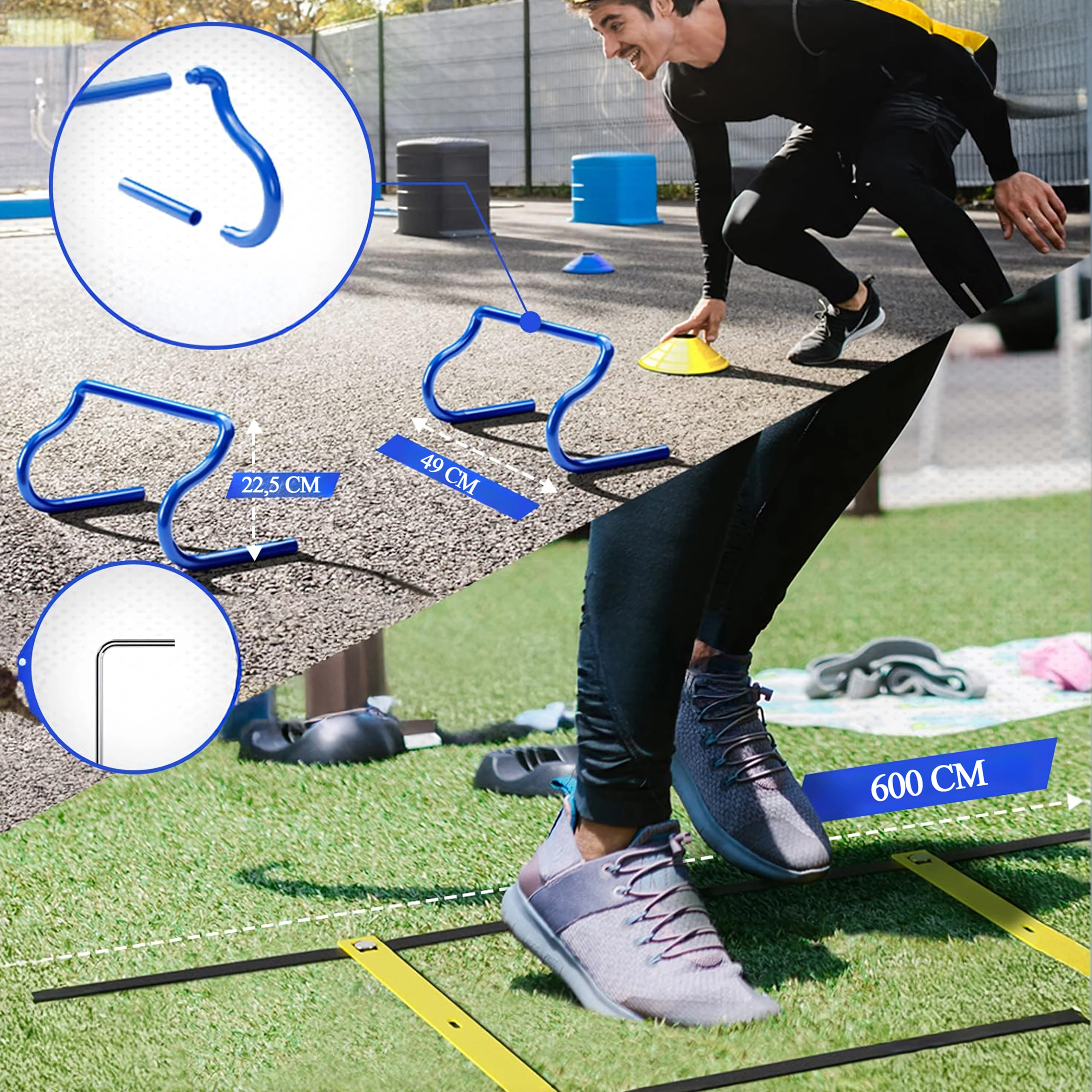 Tato univerzální tréninková sada XXL je navržena pro sportovce všech úrovní. Pomáhá efektivně rozvíjet rychlost nohou, akceleraci, změny směru i koordinační přesnost. Všechny prvky jsou lehké, odolné a rychle připravené k použití jak na hřišti, tak v tělocvičně.