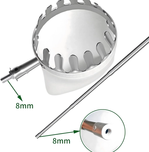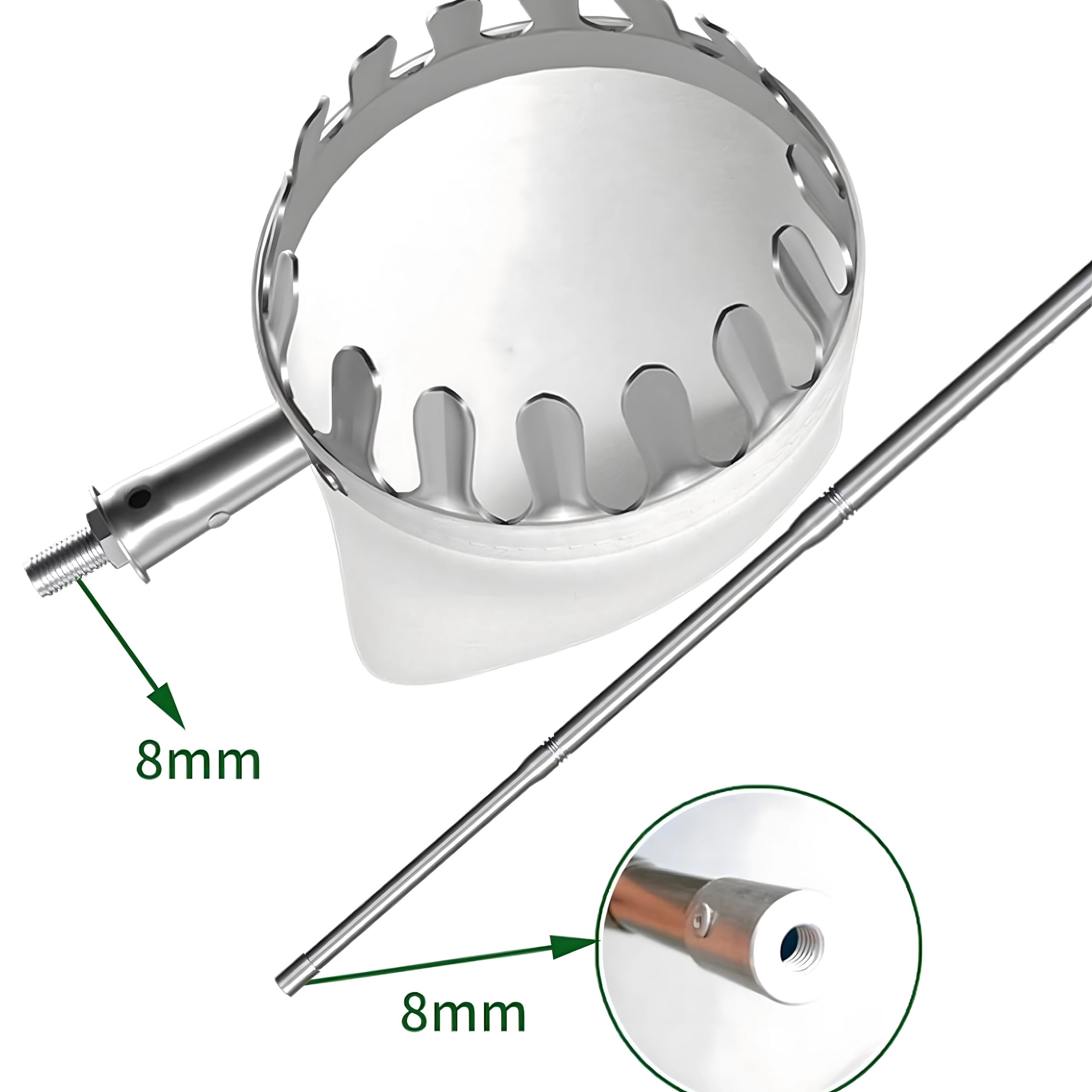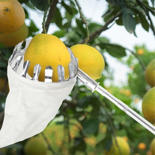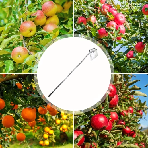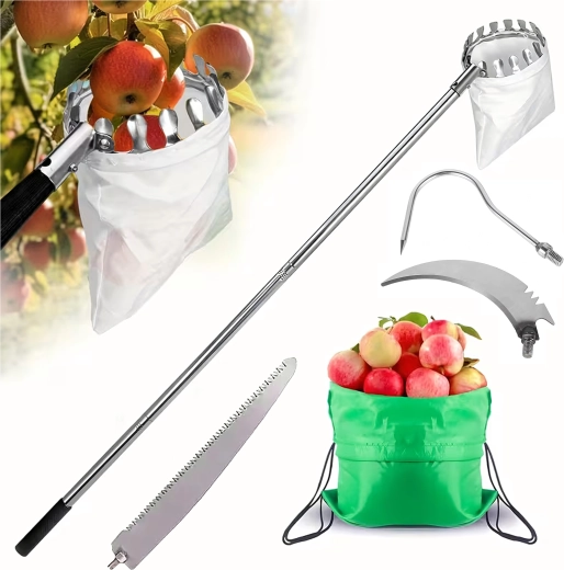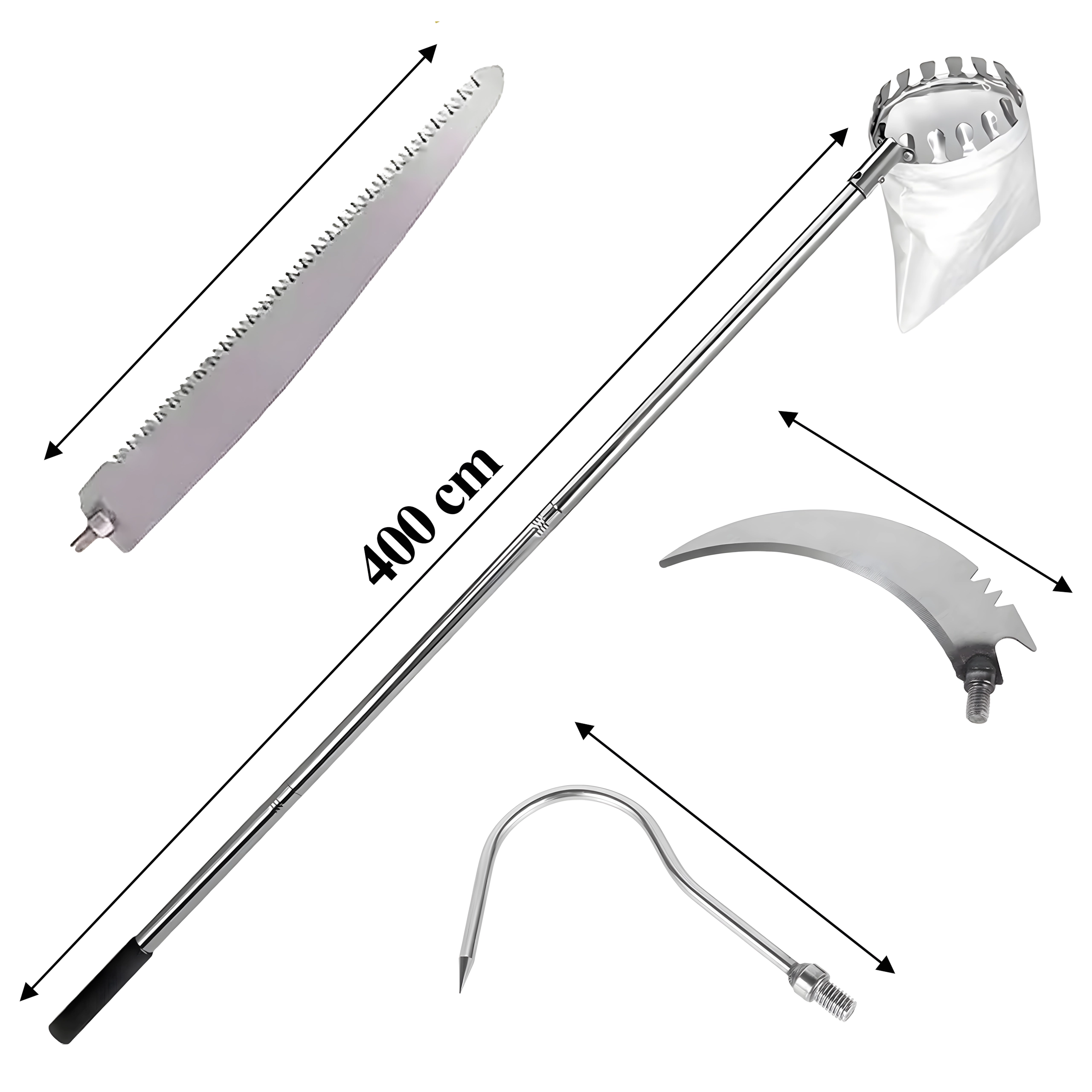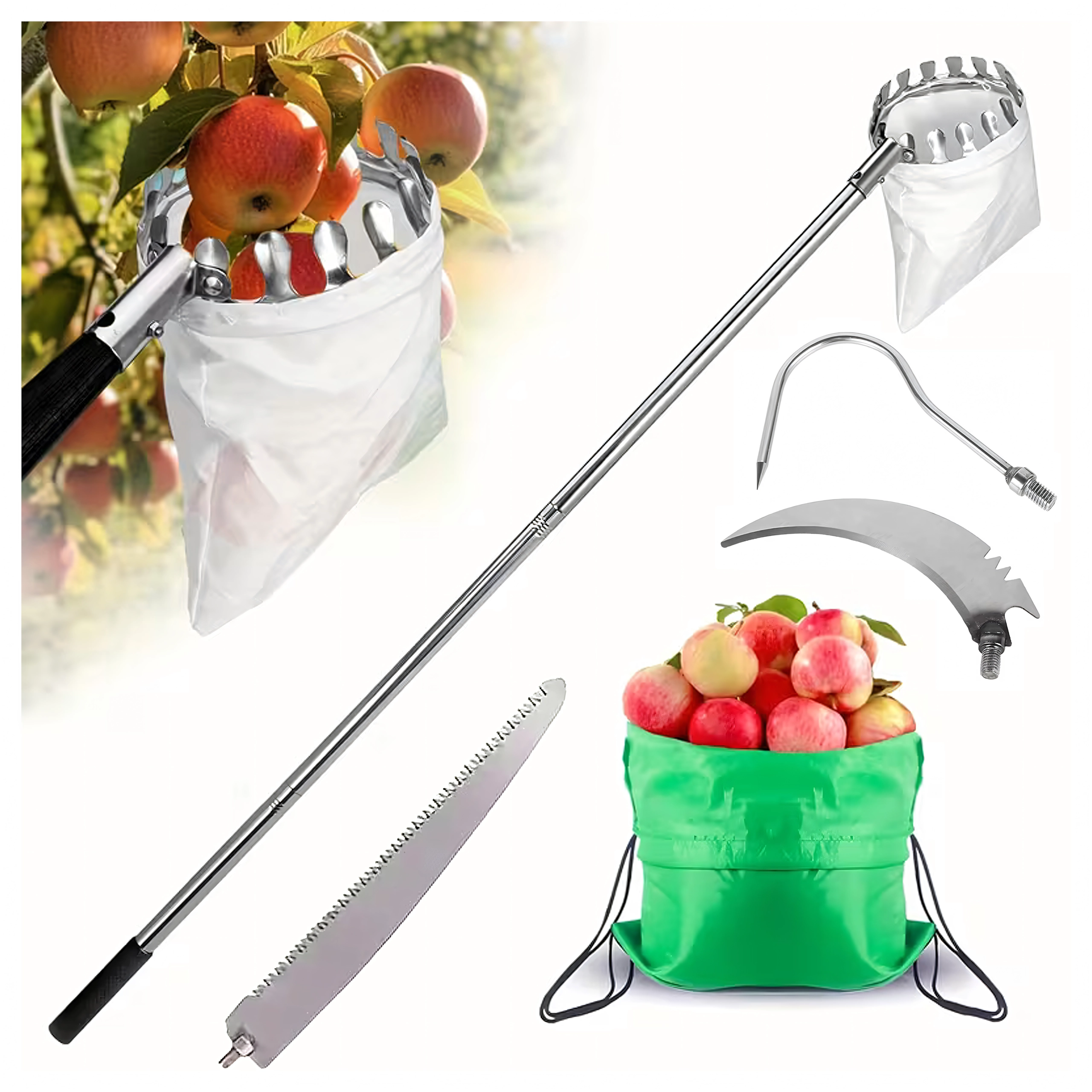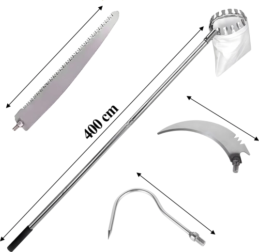 Součástí je sada 4 koncovek (např. háček, malá pilka/čepel, držák/česač, pomocný nástavec) pro snadné odtržení či seříznutí plodů a práci v husté koruně. Konstrukce z kovu zajišťuje odolnost a stabilitu, přesto je nástroj lehký a dobře ovladatelný. Skvělé pro jablka, hrušky, švestky, citrusy a další druhy ovoce.