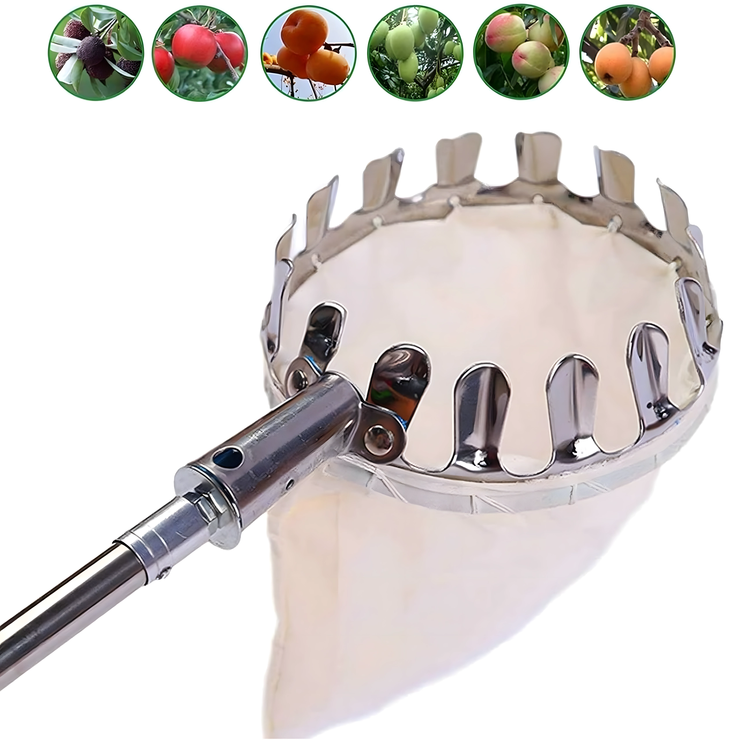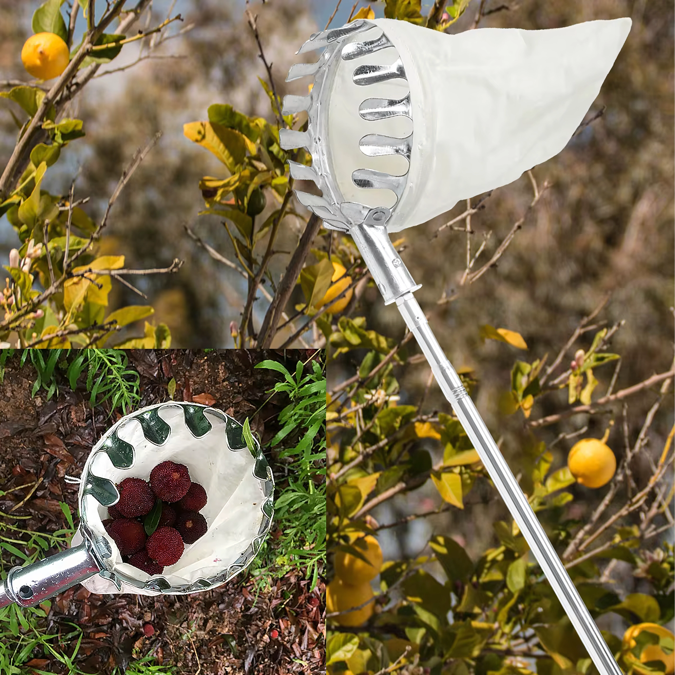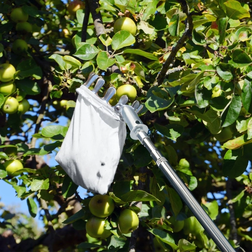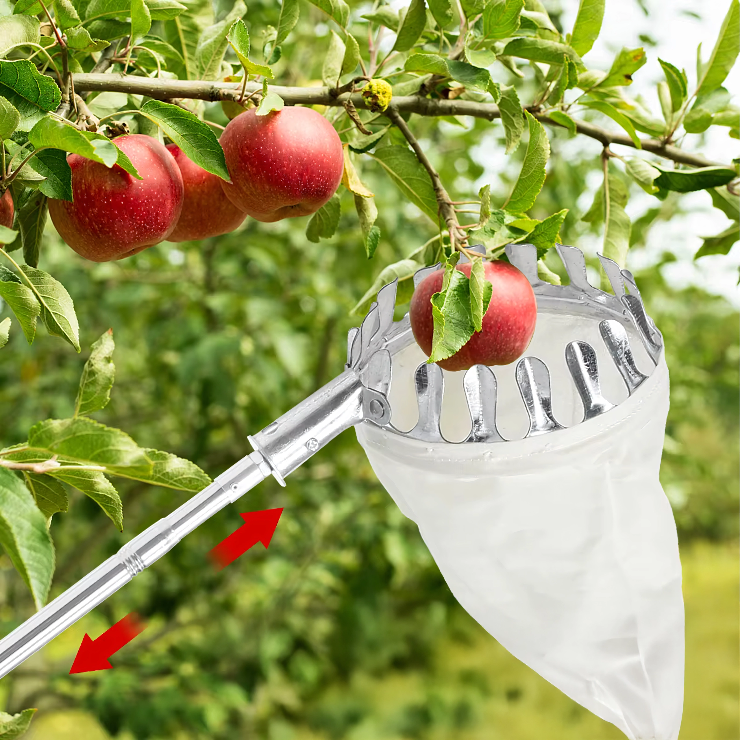 Teleskopická kovová tyč umožní sklízet i z nejvyšších větví bez lezení. Lehká, ale pevná konstrukce pro pohodlné ovládání.
