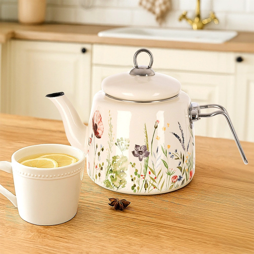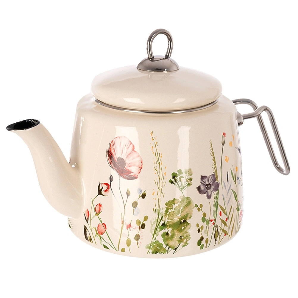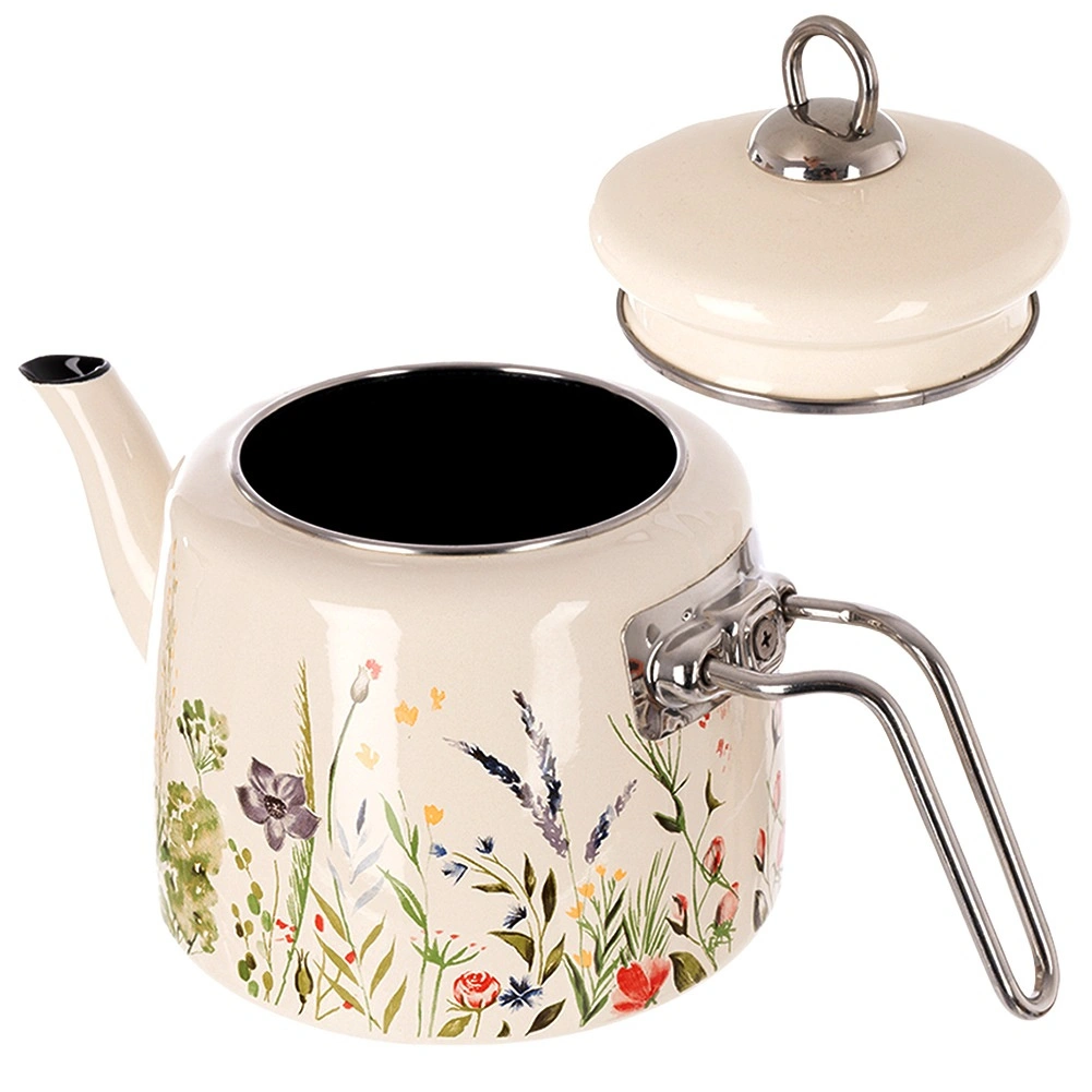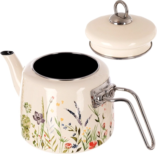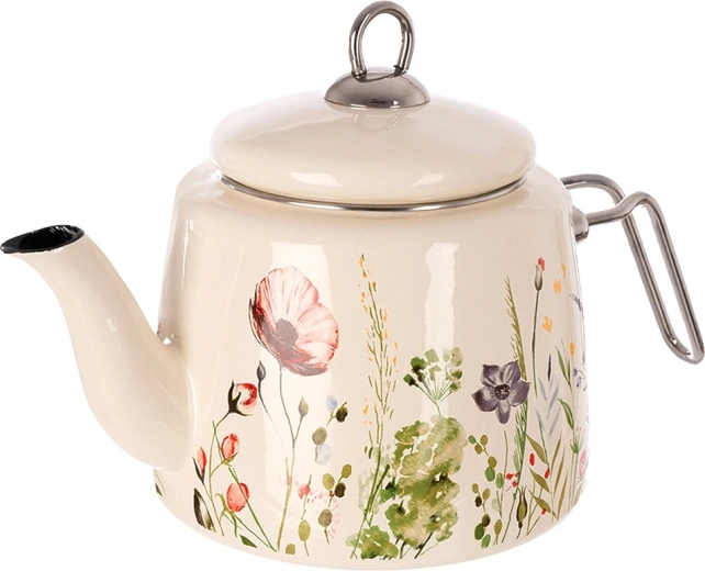 Stylový krémový čajník s květinovým dekorem je ideální pro každodenní vaření vody na čaj, kávu či bylinky i pro přímé servírování na stůl. Odolná smaltovaná ocel je zdravotně nezávadná a vhodná i pro alergiky, nerezové detaily zajišťují pevnost a dlouhou životnost.