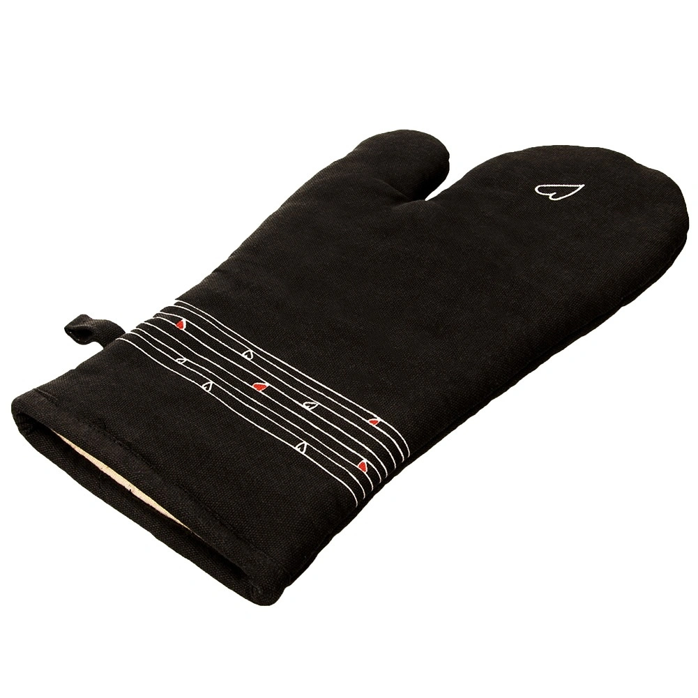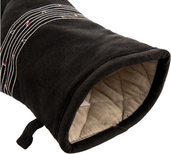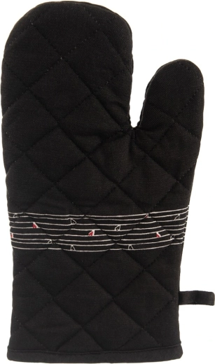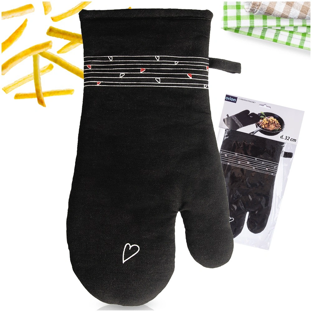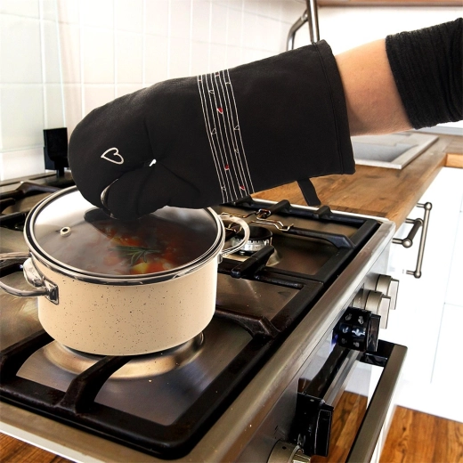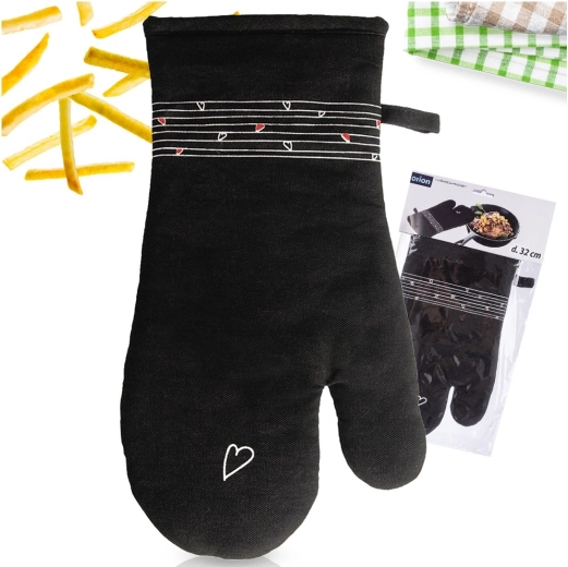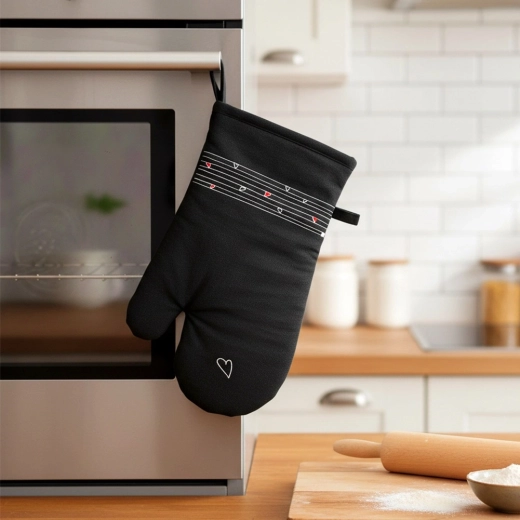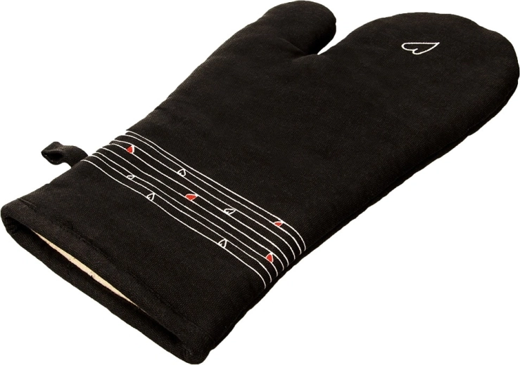 Tato odolná bavlněná rukavice je nepostradatelným pomocníkem při vaření i pečení. Díky kvalitnímu prošívání a měkké výplni poskytuje spolehlivou tepelnou ochranu a příjemně sedí na ruce. Elegantní černý design s decentním motivem srdíček se hodí do každé kuchyně.