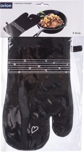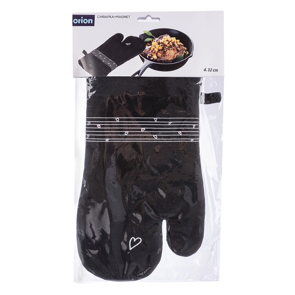 Praktická kuchyňská rukavice z 100% bavlny v elegantní černé barvě s jemným motivem srdce chrání ruce před horkem a usnadňuje bezpečnou manipulaci s nádobím. Díky univerzální velikosti 18 × 32 cm padne na pravou i levou ruku, integrovaný magnet a poutko na zavěšení zajistí, že ji budete mít vždy po ruce. Lze prát do 30 °C.