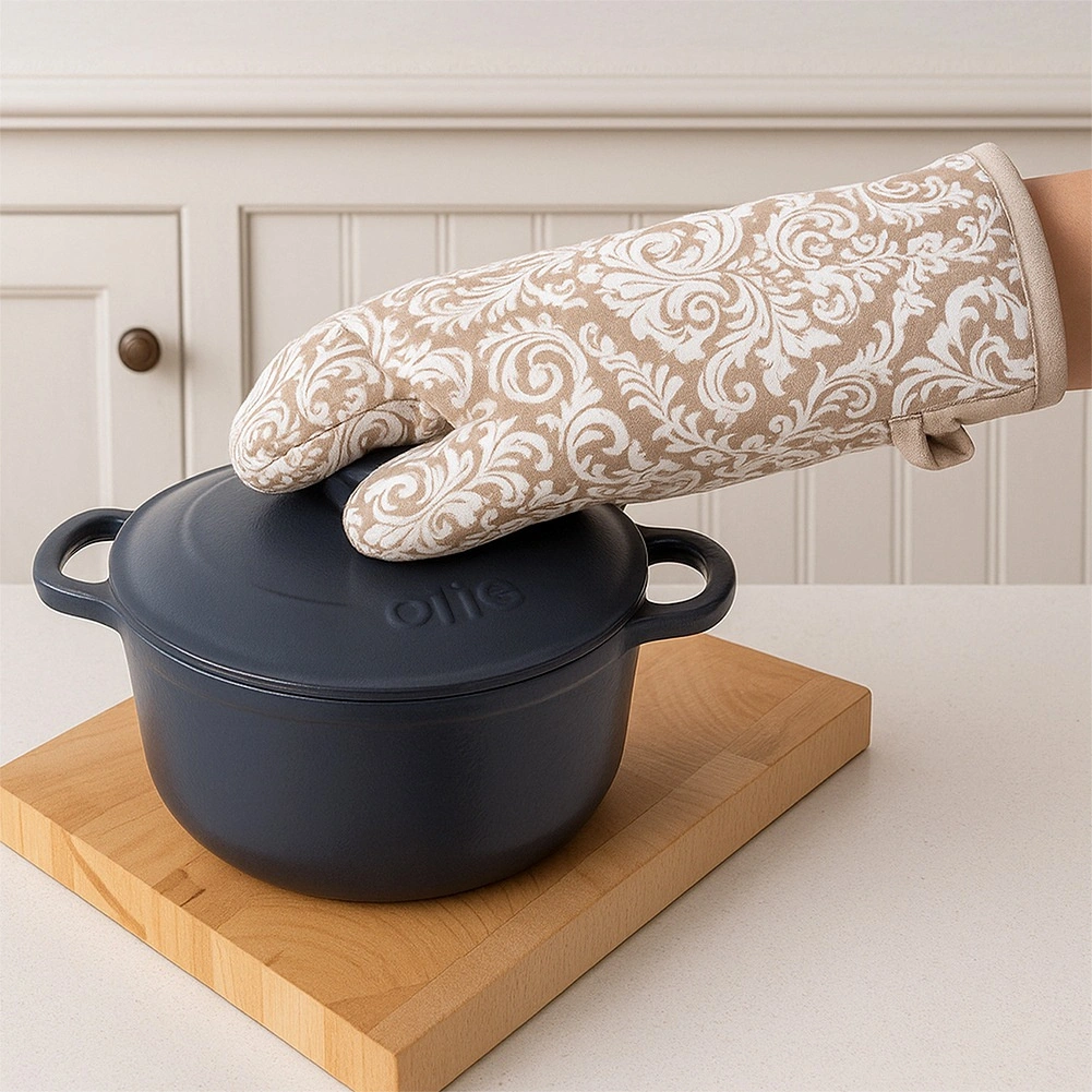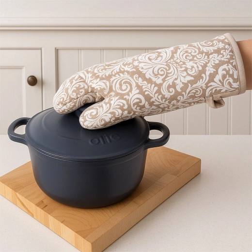 Tato stylová bavlněná rukavice chrání ruce před horkem při manipulaci s nádobím z trouby či z varné desky. Měkké polstrování a prošití zajišťují pohodlí a jistý úchop, zatímco praktické detaily – poutko a magnet – usnadňují skladování přímo tam, kde ji nejčastěji potřebujete.