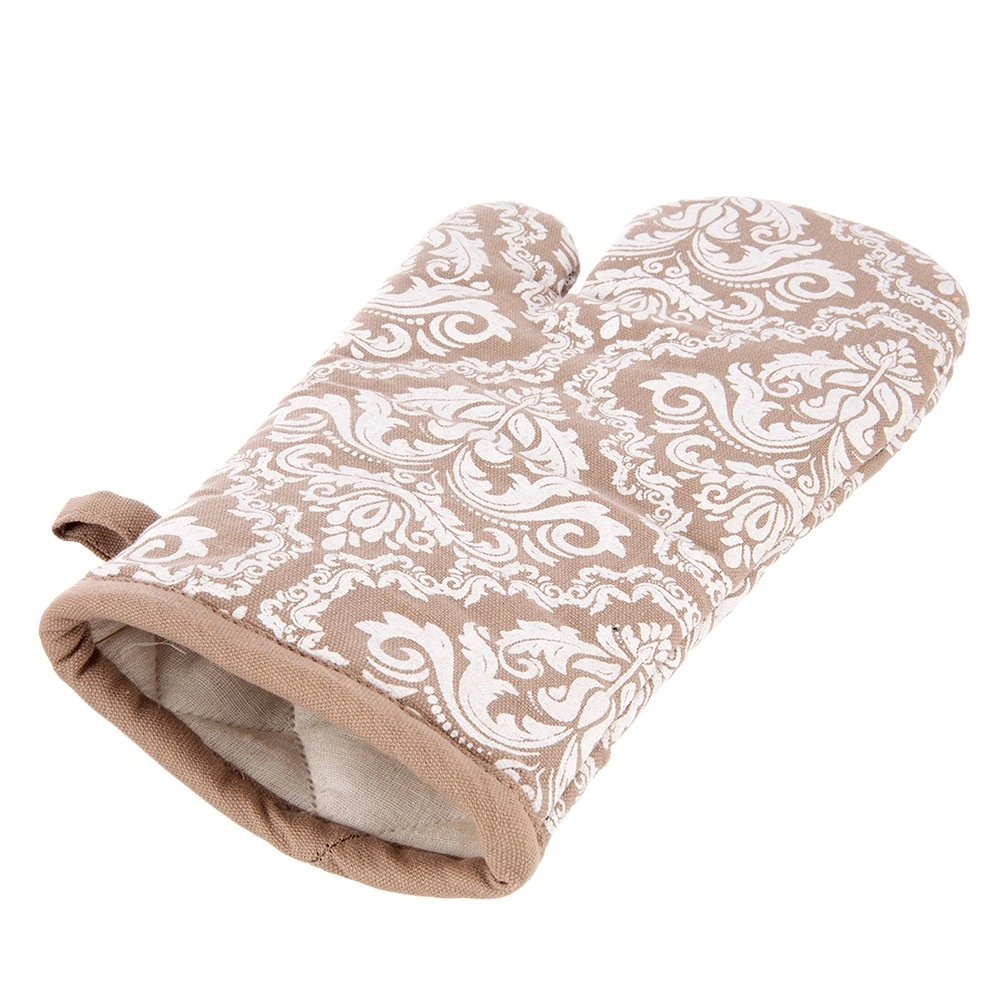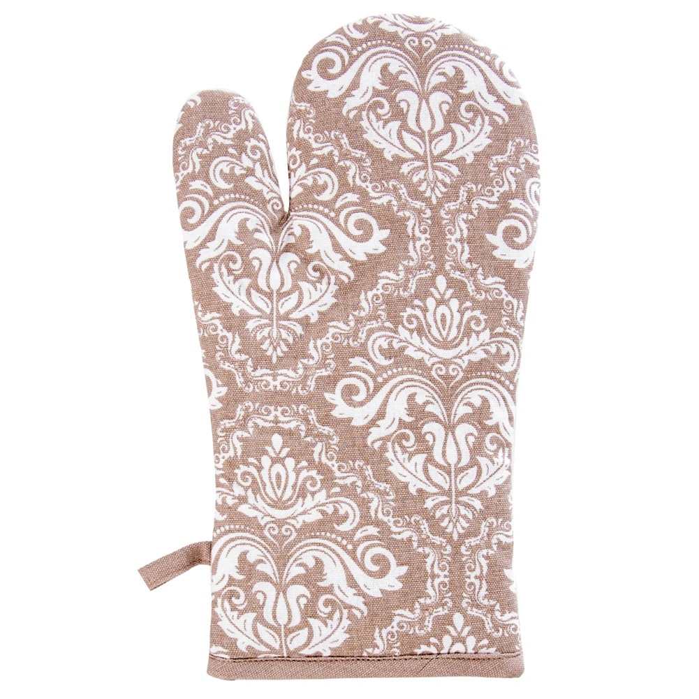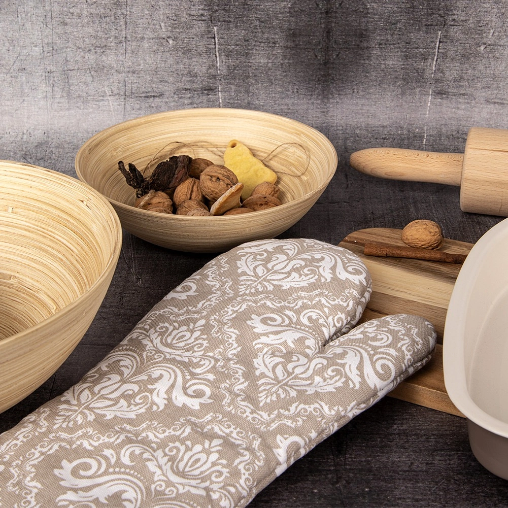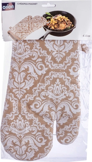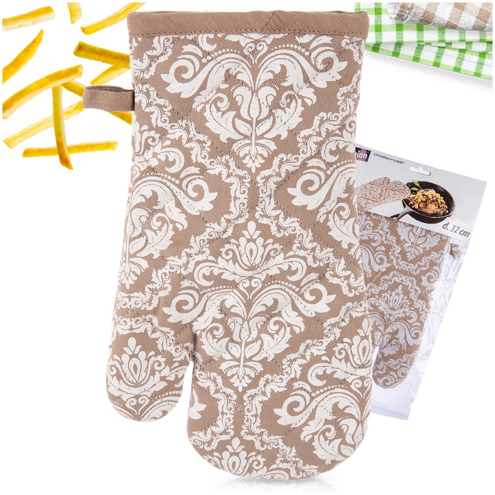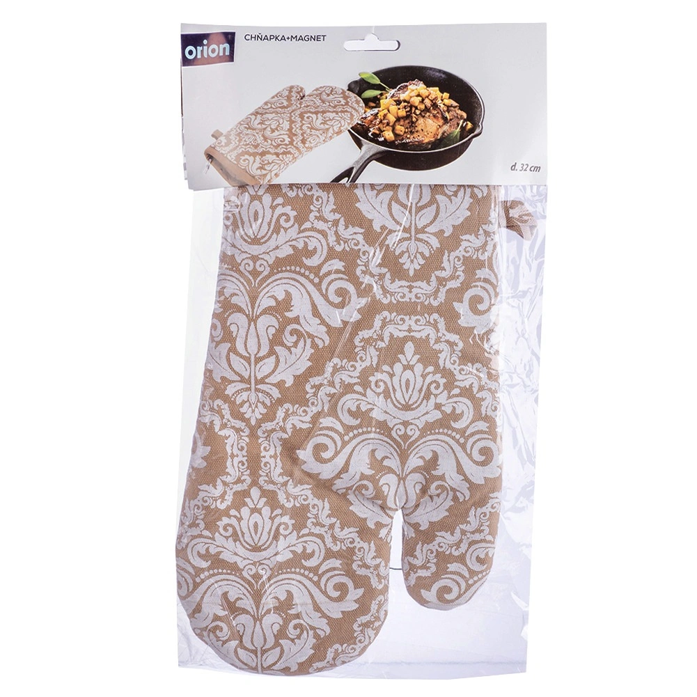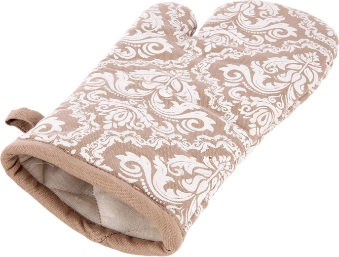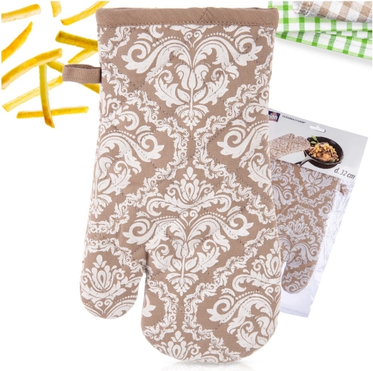 Praktická kuchyňská rukavice z kvalitní 100% bavlny v elegantní béžové barvě s bílým vzorem nabízí spolehlivou tepelnou ochranu při vaření a pečení. Díky univerzální velikosti 18 × 32 cm padne na pravou i levou ruku, má poutko na zavěšení a integrovaný magnet pro snadné uchycení na kovové povrchy. Lze prát do 30 °C.