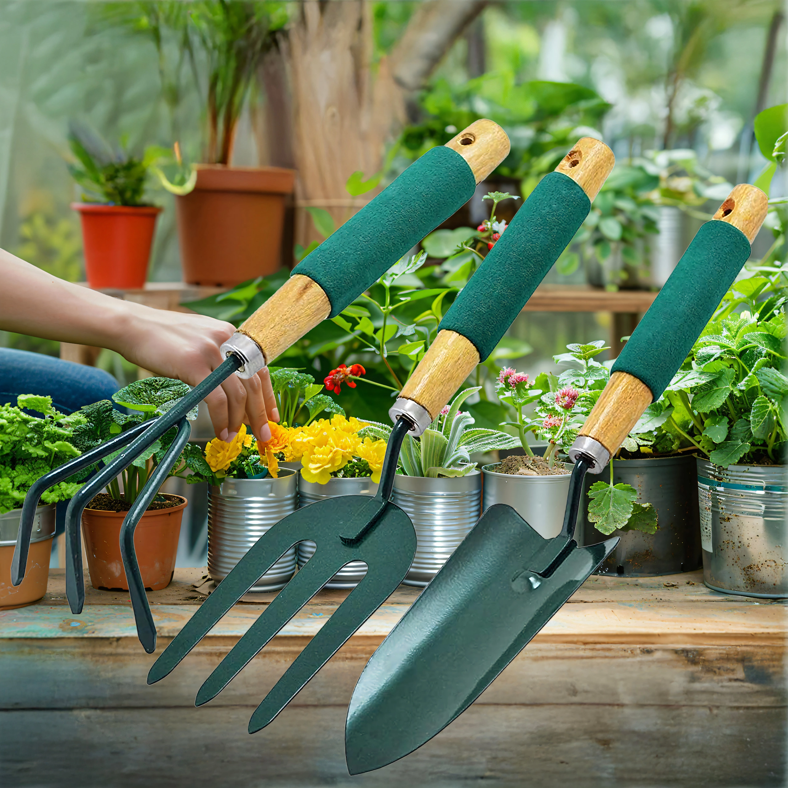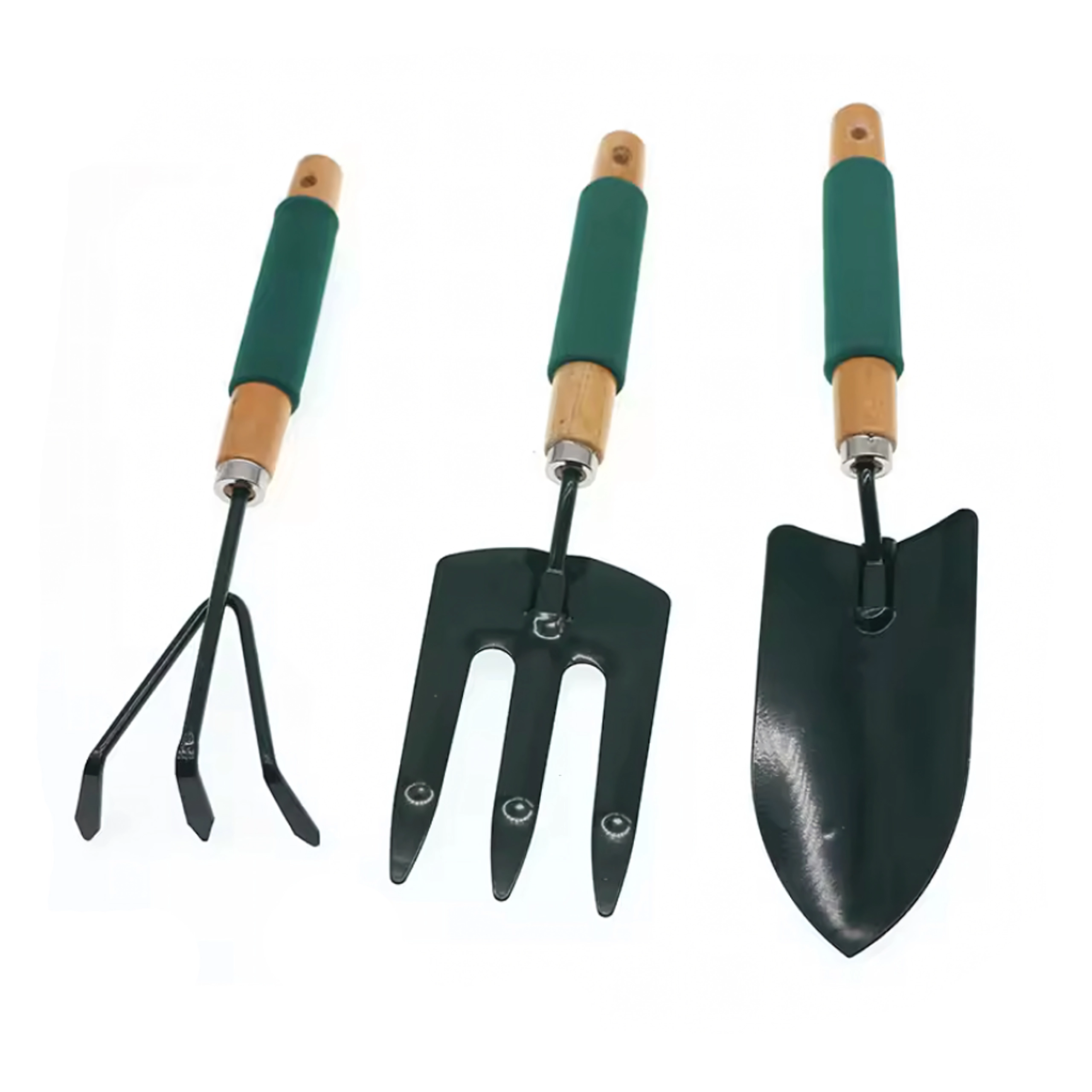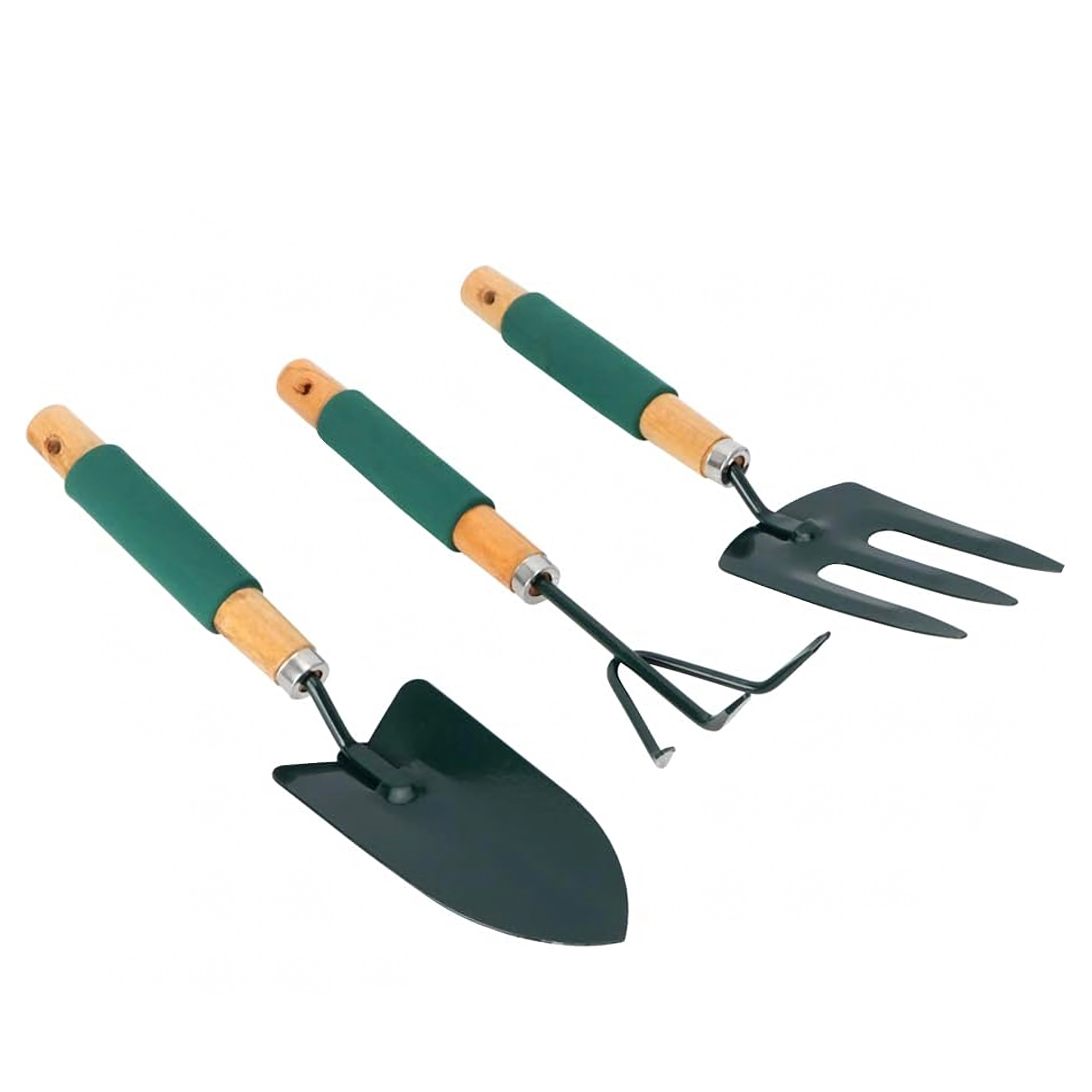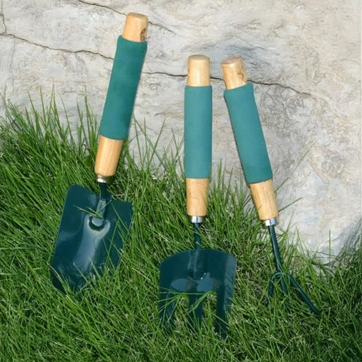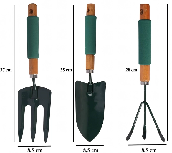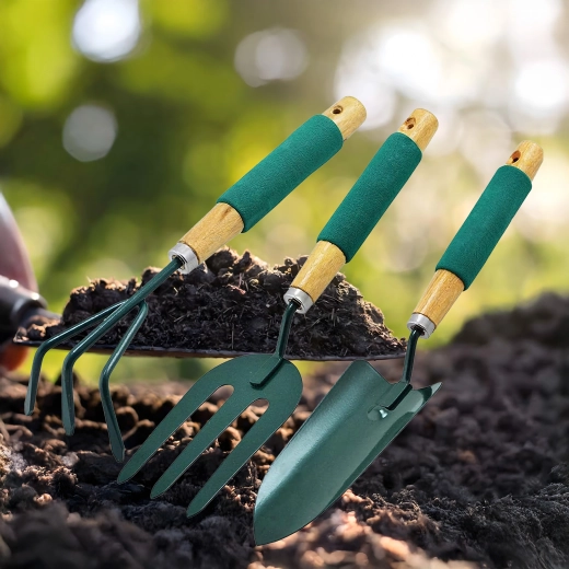 Praktická sada tří ručních nástrojů pro péči o záhony a květináče – lopatka, kultivátor/mini hrábě a zahradní vidlička. Odolné kovové pracovní části a ergonomické, neklouzavé rukojeti zajišťují pohodlnou práci při rylování, kypření půdy a přesazování.