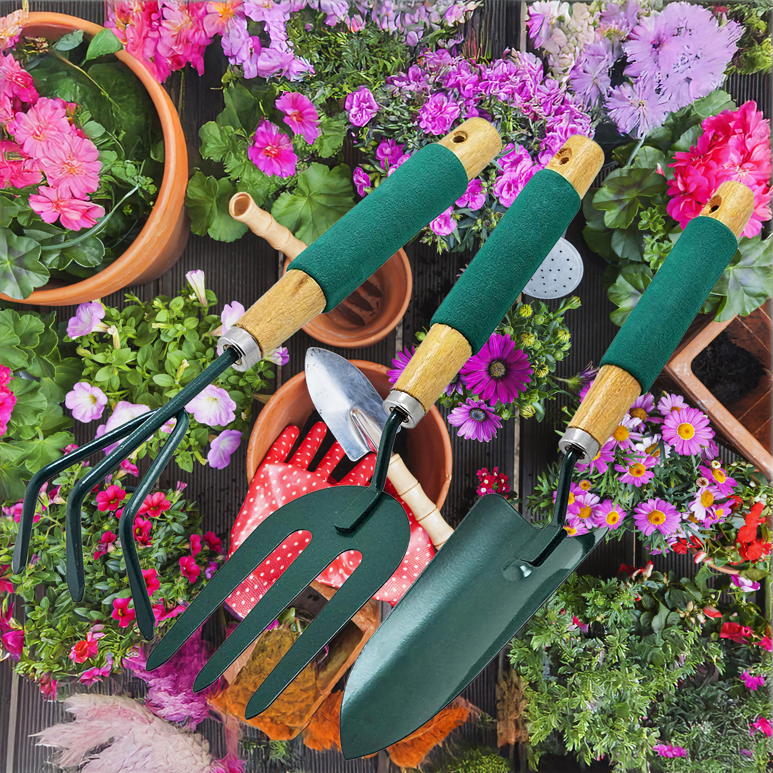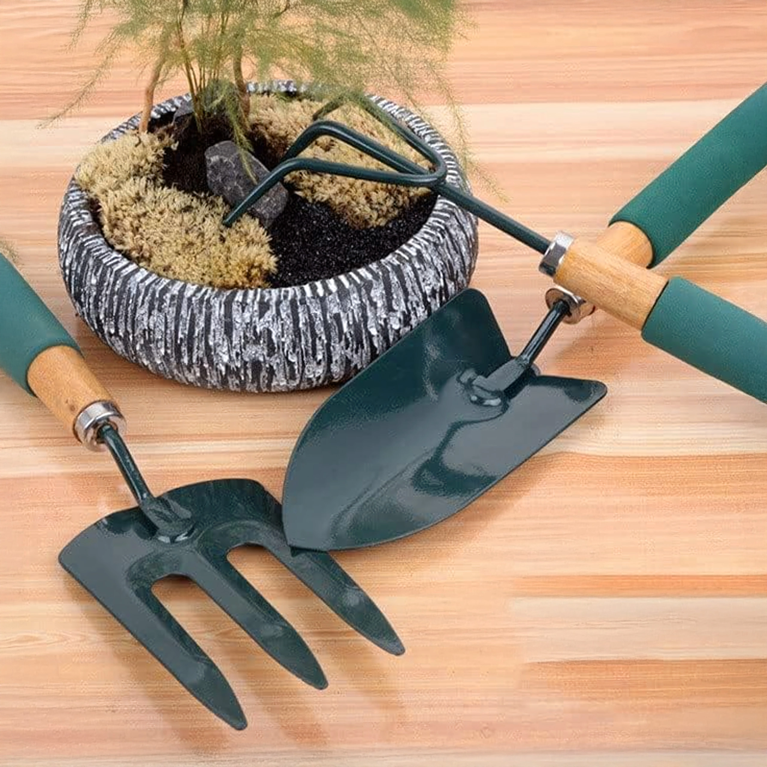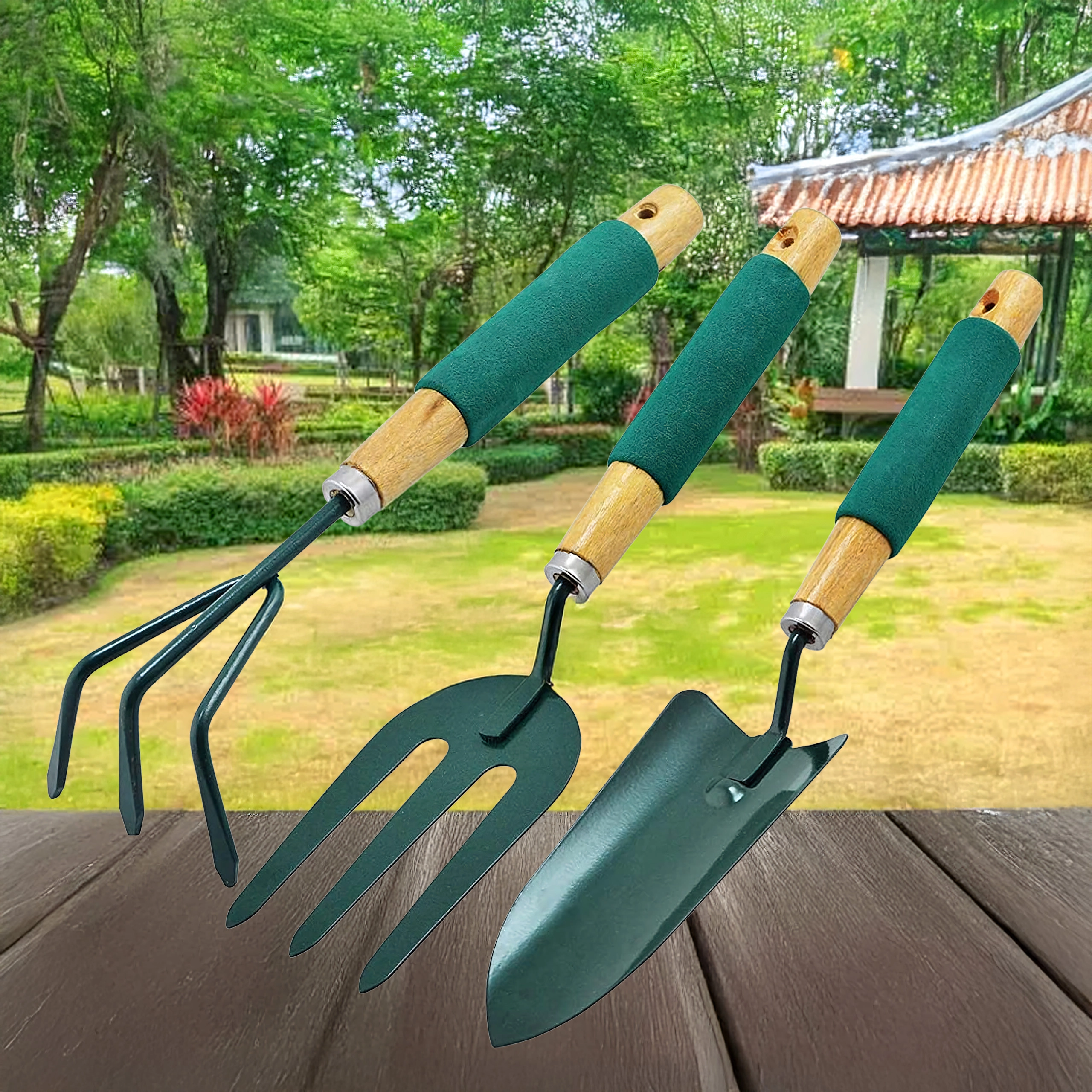 Praktická sada tří ručních nástrojů pro péči o záhony a květináče – lopatka, kultivátor/mini hrábě a zahradní vidlička. Odolné kovové pracovní části a ergonomické, neklouzavé rukojeti zajišťují pohodlnou práci při rylování, kypření půdy a přesazování.