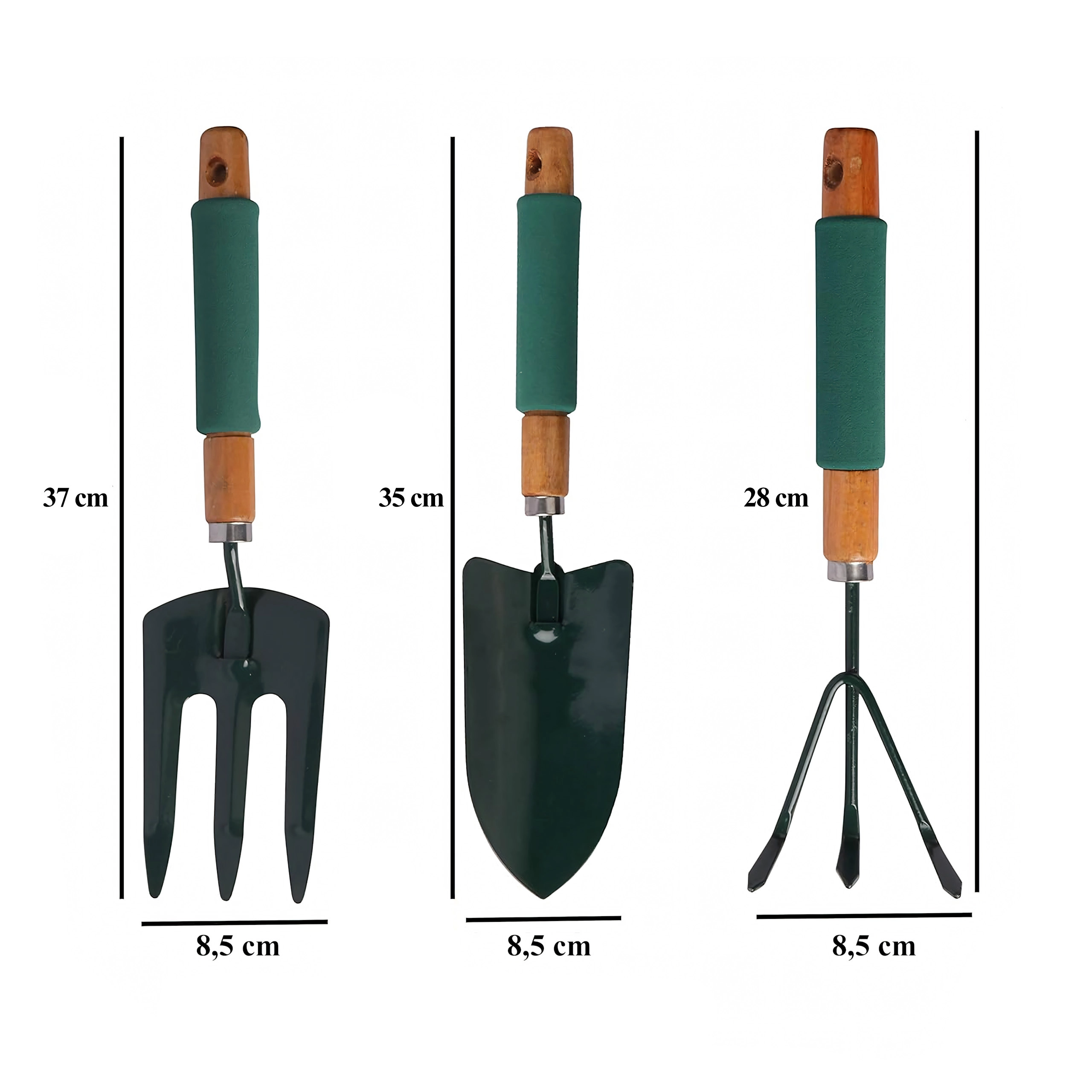 - 3 (lopatka, kultivátor/mini hrábě, zahradní vidlička)