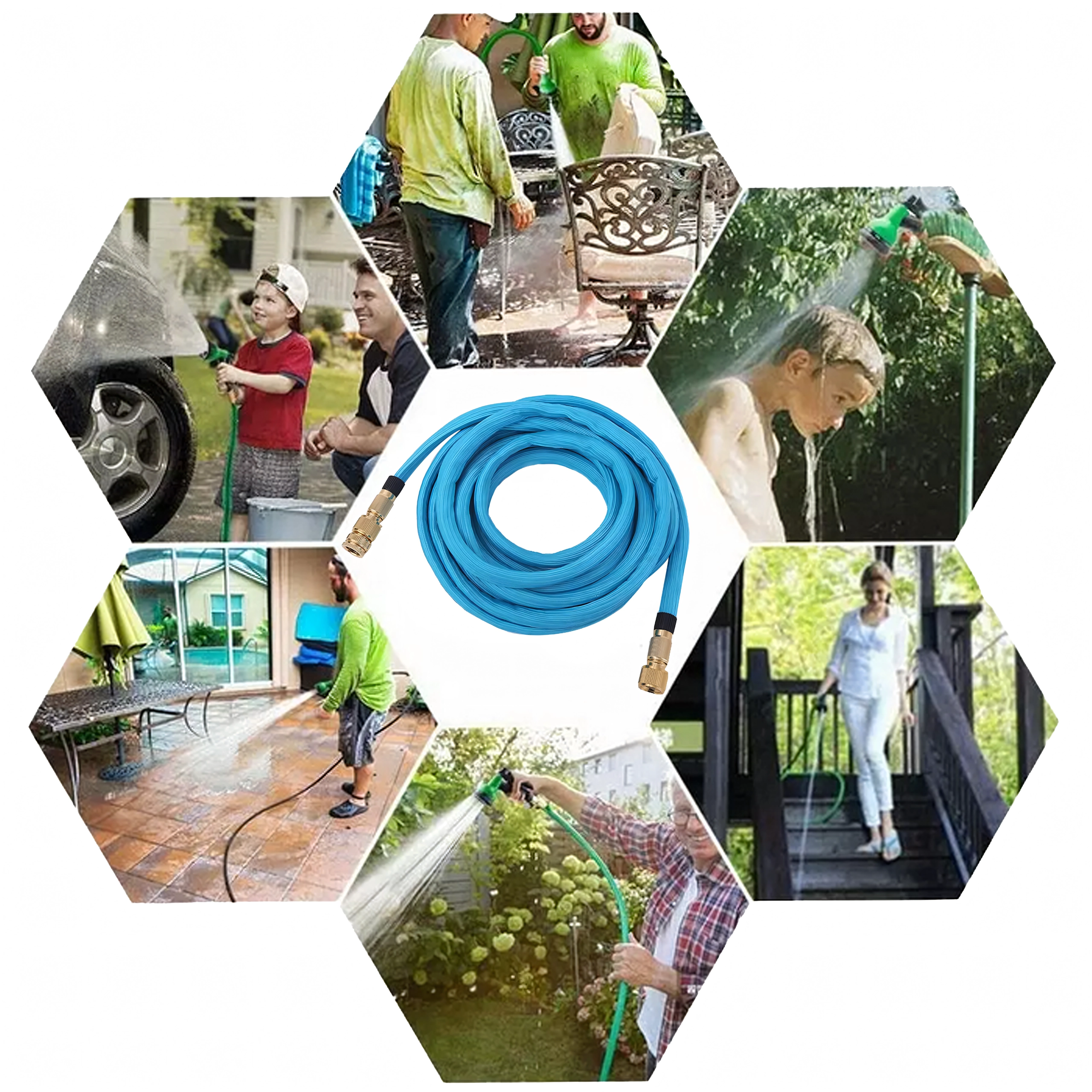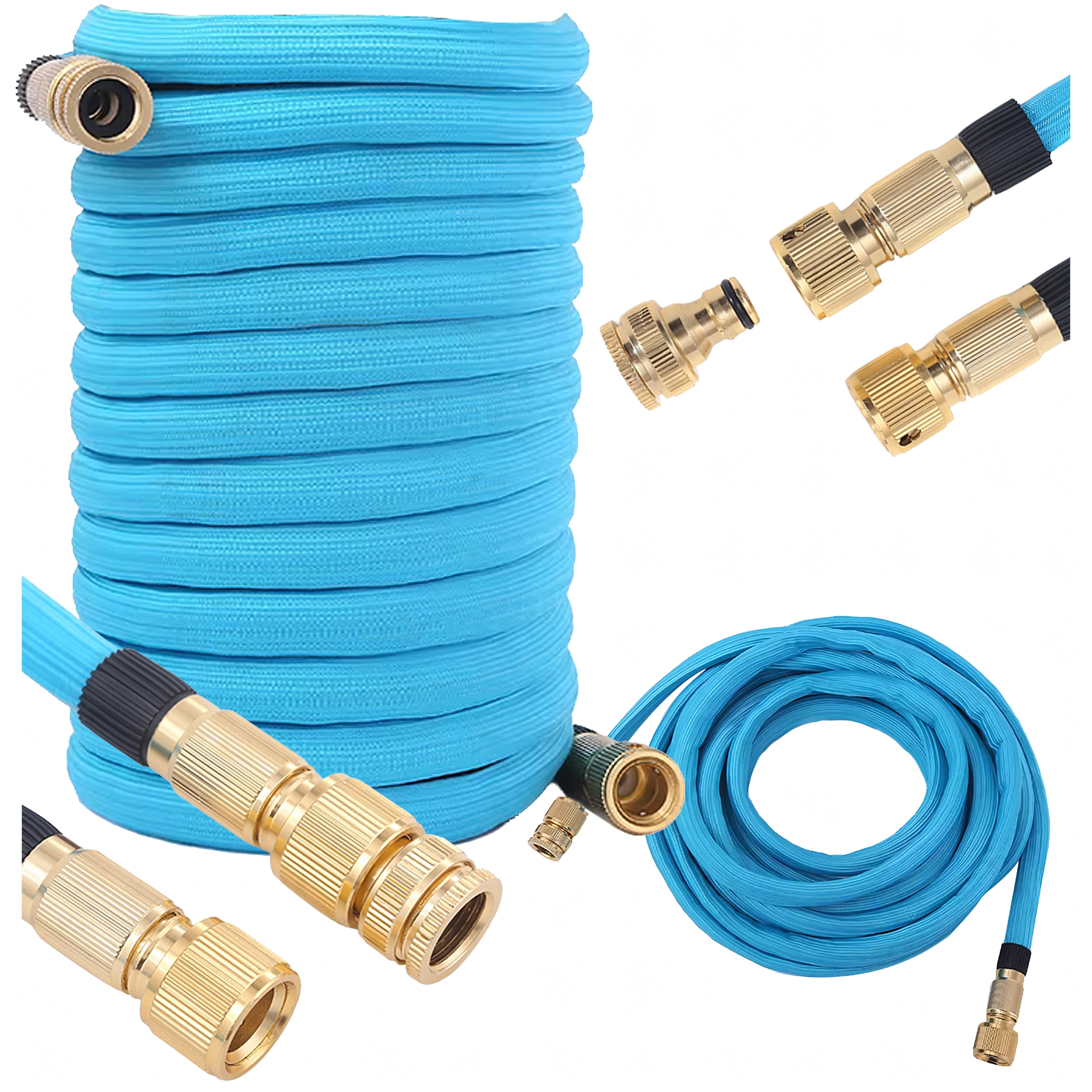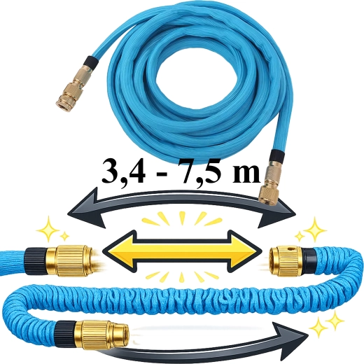 Tato roztažitelná hadice je ideální pro zalévání zahrady, mytí auta či úklid terasy. Při otevření vody se automaticky prodlouží až na 7,5 m a po vypuštění se vrátí na kompaktních 3,4 m. Mosazné rychlospojky s těsněním O‑kroužky zajišťují dlouhou životnost a minimální riziko úniku.