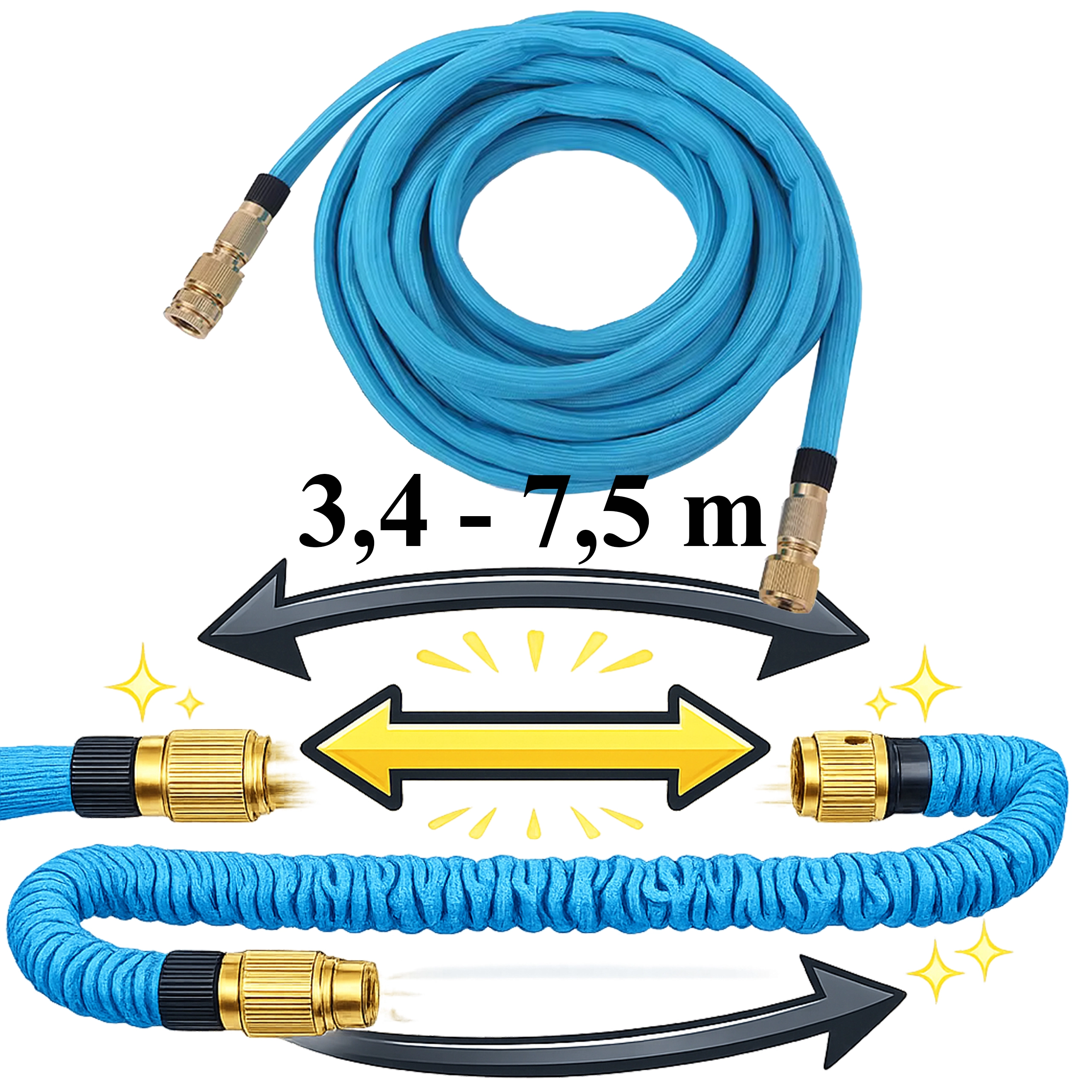 Hadice se při průtoku vody prodlouží až na 7,5 m, po vypnutí se smrští pro úsporné skladování. Ideální pro zahradu, terasu i mytí auta.