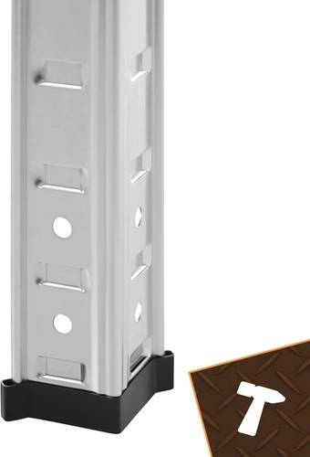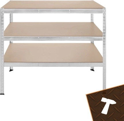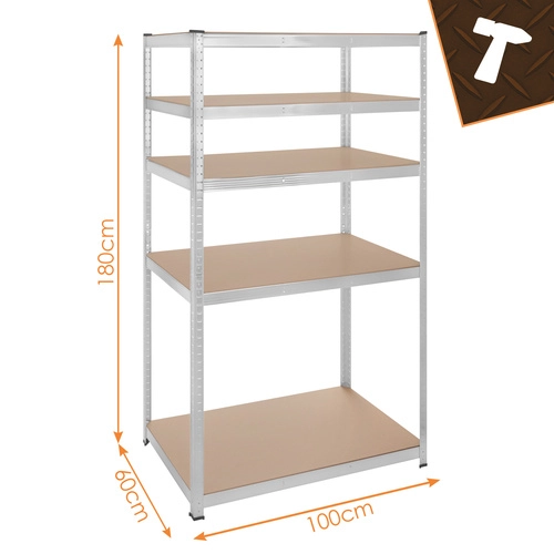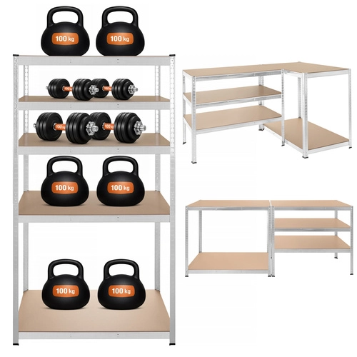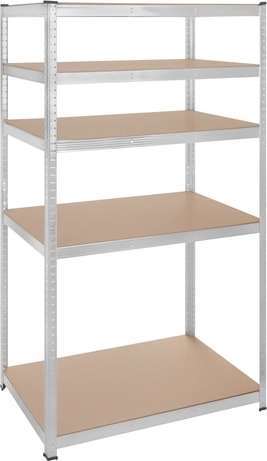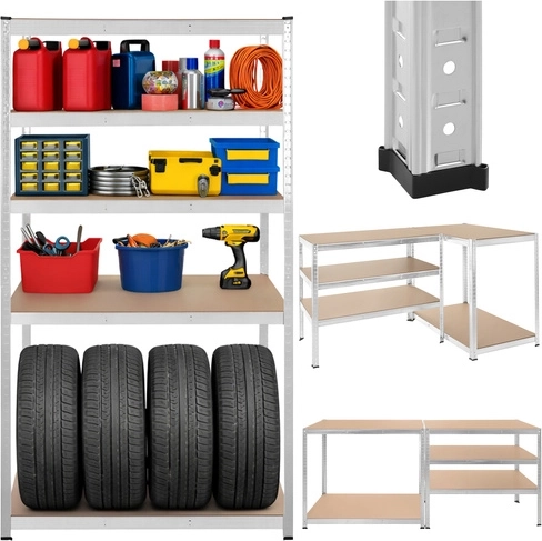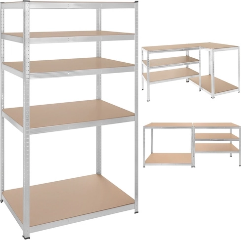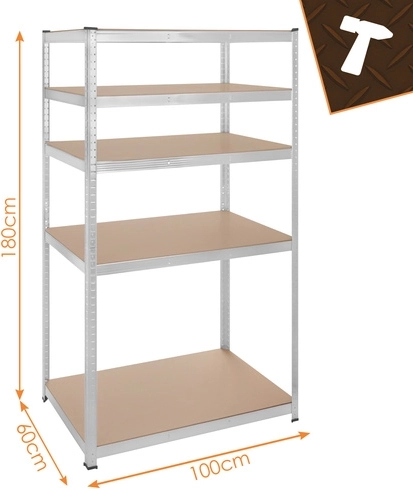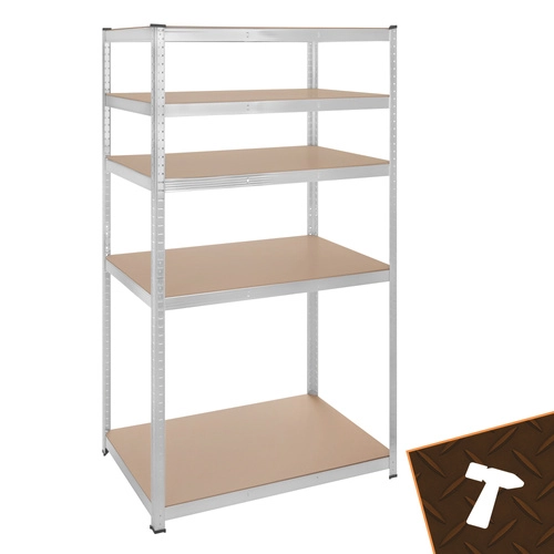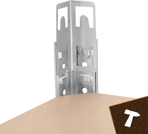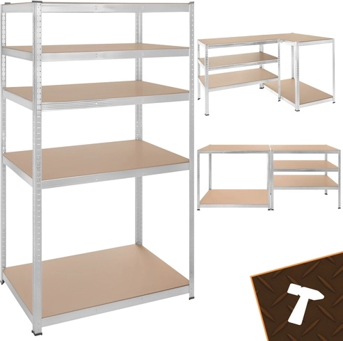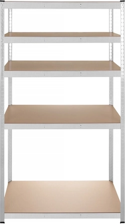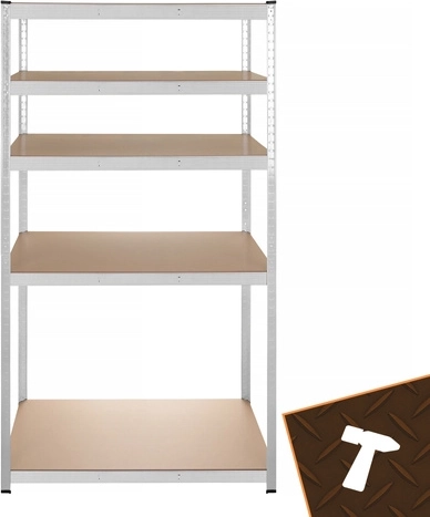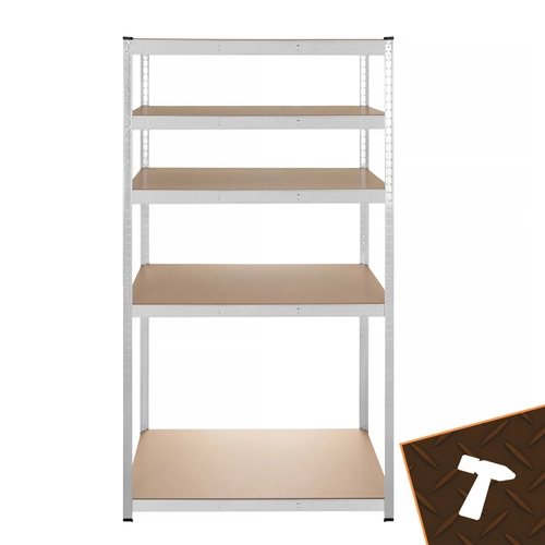 Regál má bezšroubový zasouvací systém pro rychlou montáž a jemné nastavení výšky polic po 30 mm, aby se snadno přizpůsobil různě velkým předmětům. Zinkovaná povrchová úprava chrání proti korozi a plastové koncovky nohou chrání podlahu.