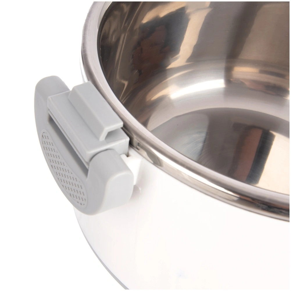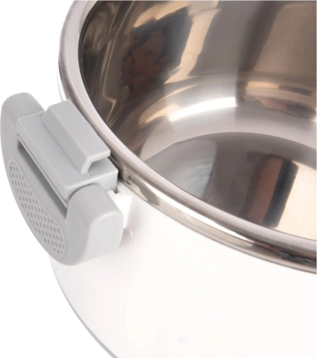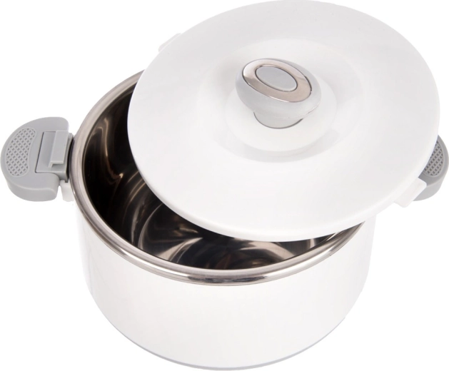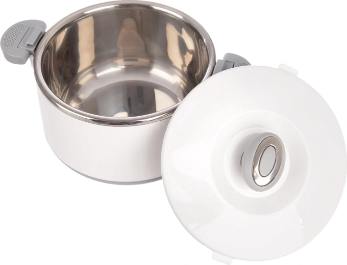 Vnitřek z nerezové oceli je hladký a snadno se čistí, vnější plastový plášť v bílé barvě je lehký a odolný proti každodennímu používání.
