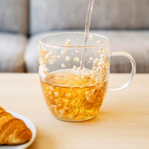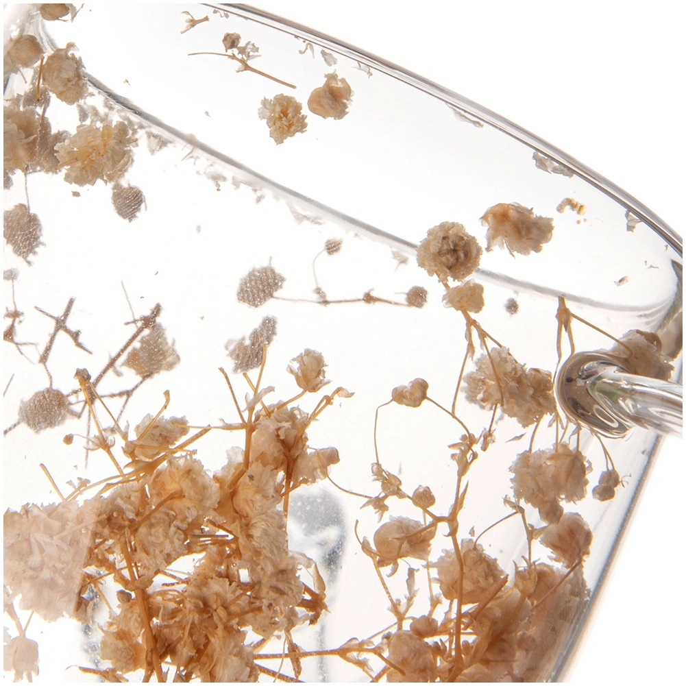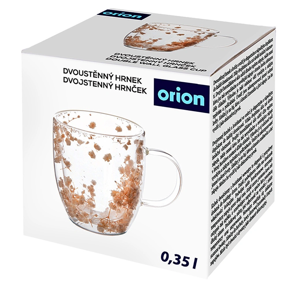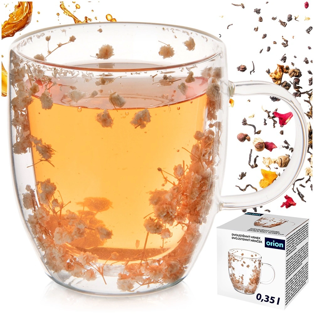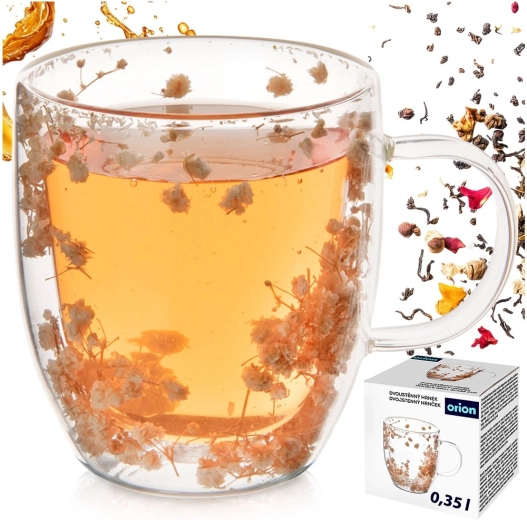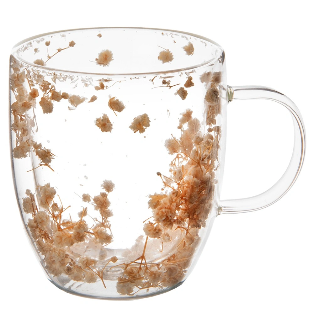 Elegantní skleněný hrnek s dvojitou stěnou udrží vaše nápoje déle teplé i studené. Vyroben z borosilikátového skla, je odolný vůči teplotám -10 °C až +150 °C, škrábancům i chemikáliím. Pohodlné ucho a originální dekor sušených květů mezi stěnami dodají každému doušku styl.