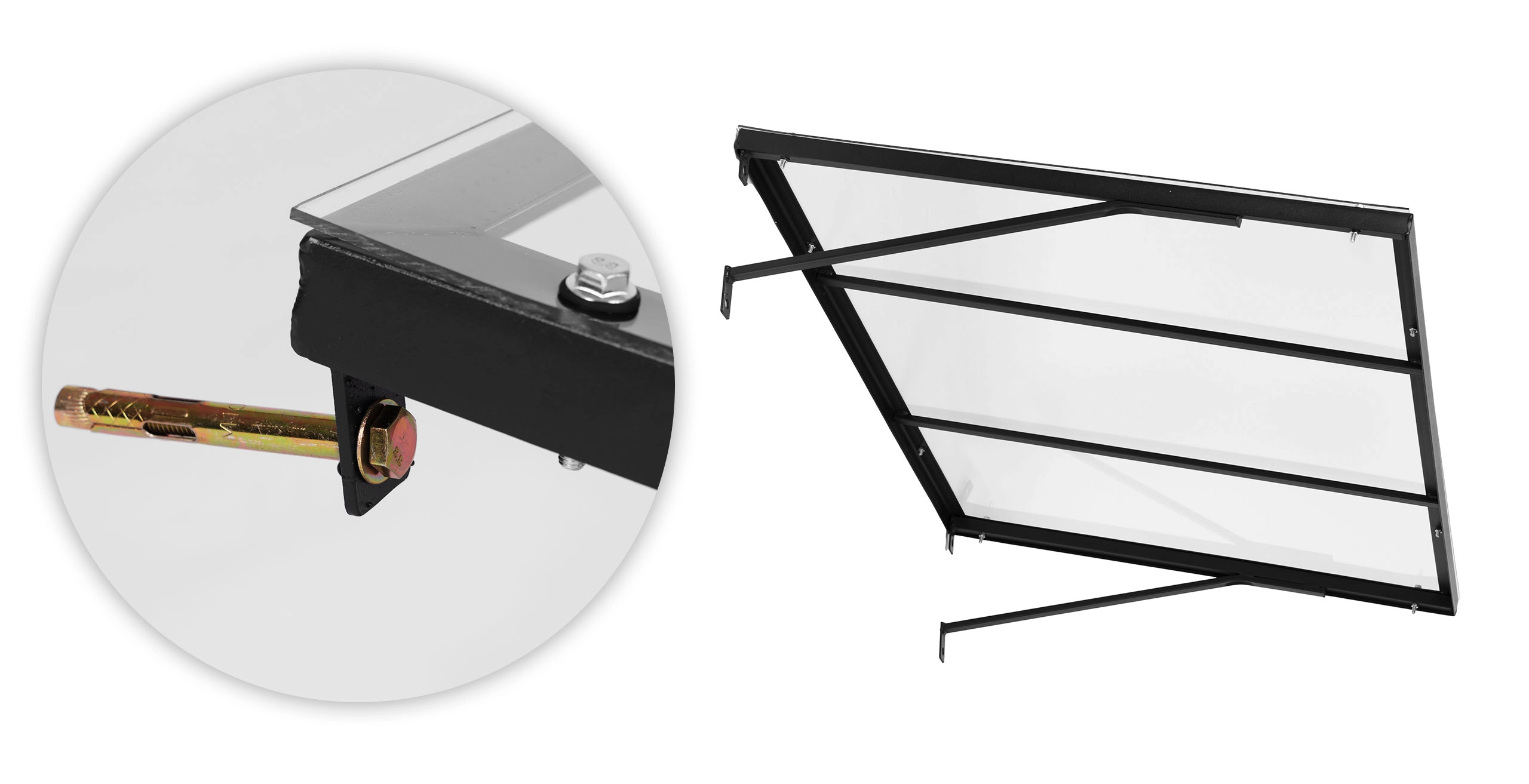 Díky připraveným montážním bodům a přiložené sadě čtyř kotev (8,5 cm) stříšku rychle a pevně uchytíte do fasády bez nutnosti dokupovat příslušenství.