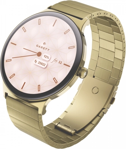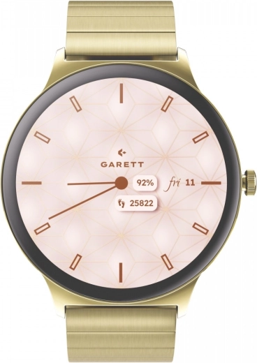 Elegantní chytré hodinky Garett Verona 2 spojují nadčasový design a moderní technologie. V balení najdete zlatý ocelový náramek i bílý kožený pásek, takže snadno přizpůsobíte styl. Nabídnou AMOLED 1,43" (466 × 466) s Always On Display, odolné Gorilla Glass, Bluetooth hovory a hlasového asistenta. Více než 100 sportovních režimů, pokročilé zdravotní měření a výdrž až 7 dní dělají z Verona 2 perfektního společníka pro každý den.
