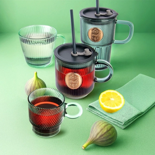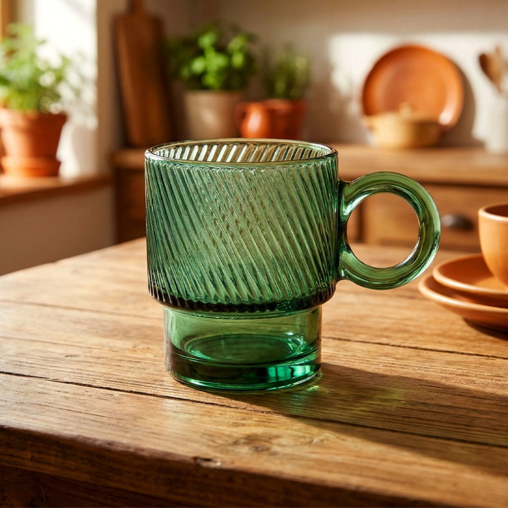 Elegantní hrnek VERDE z transparentního zeleného skla kombinuje moderní vzhled s praktičností. Rýhovaný povrch zlepšuje úchop, silnější dno zvyšuje stabilitu a čisté linie se hodí do každé kuchyně.