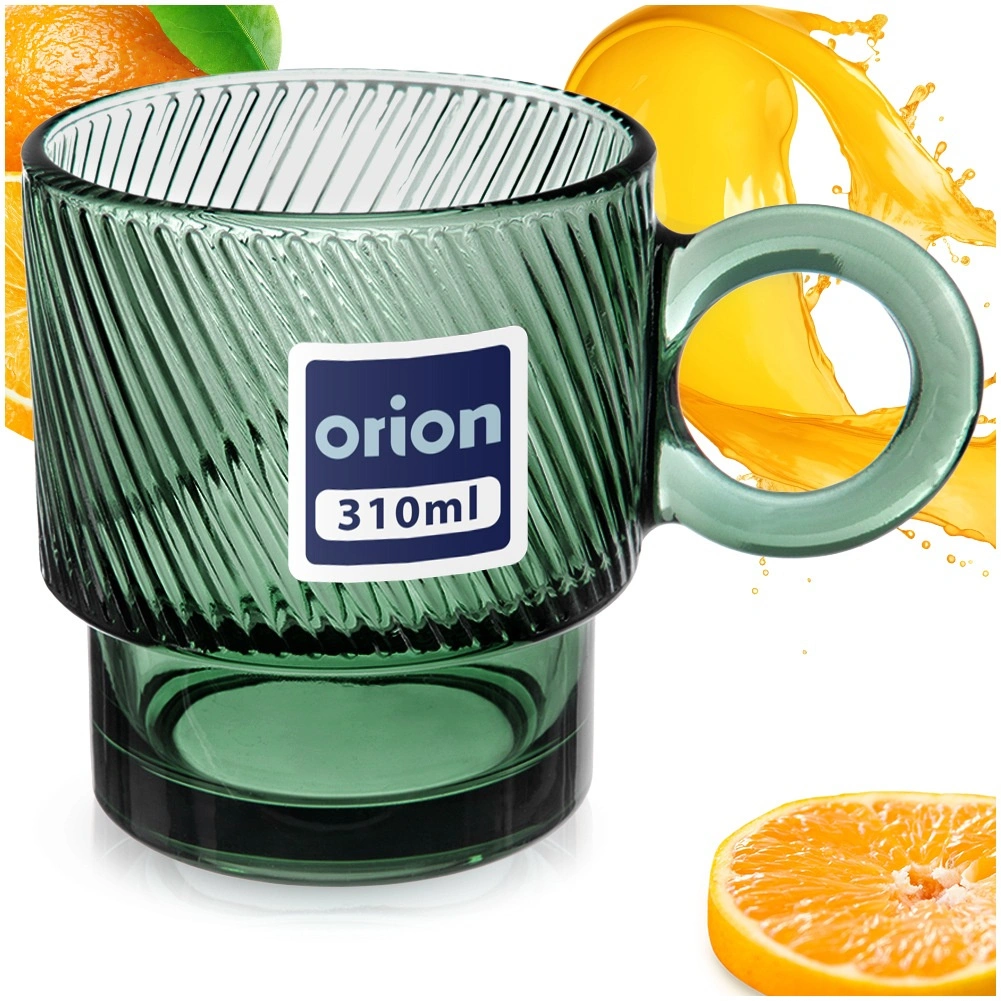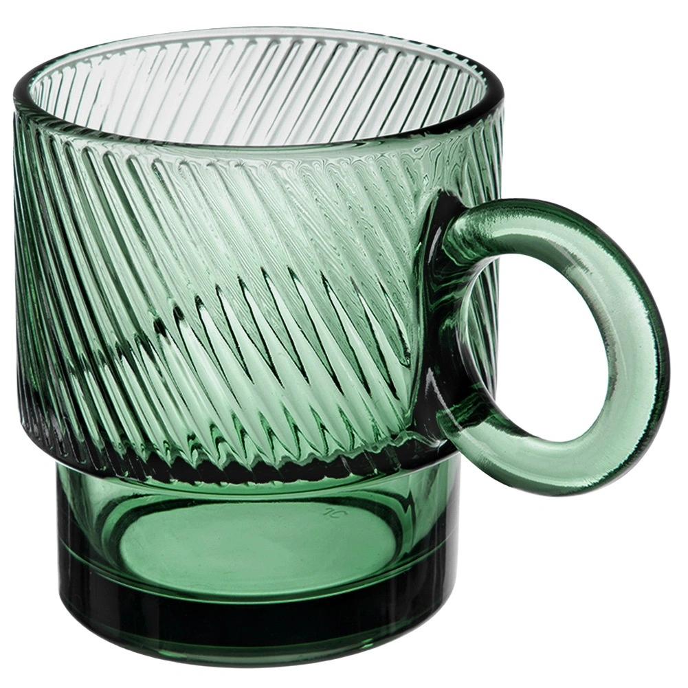 Stylový zelený hrnek z odolného skla s kapacitou 300 ml pro každodenní pití kávy, čaje i studených nápojů. Texturované rýhování dodává eleganci a jistý úchop, pohodlné ucho usnadňuje manipulaci a sklenice je vhodná do myčky. Ideální do domácnosti i do kaváren a restaurací.