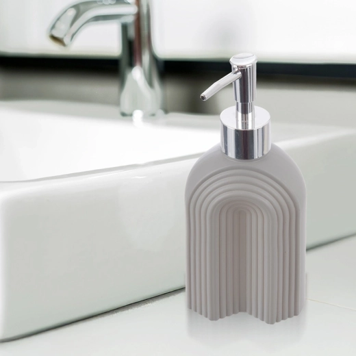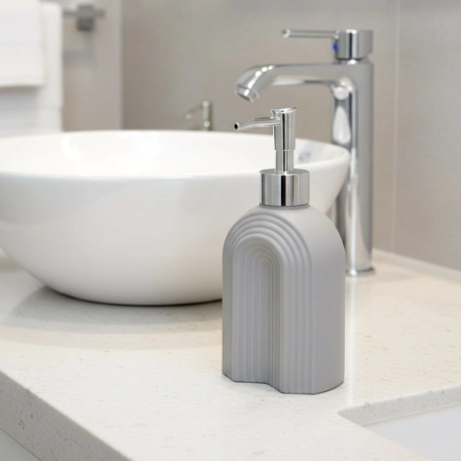 Praktický a estetický pomocník pro každodenní hygienu i úklid. Skleněné tělo v šedé barvě s jemně žebrovanou texturou dodá vašemu prostoru moderní nádech a pomůže udržet na umyvadle či kuchyňské lince pořádek. Chromově laděná pumpička zajišťuje plynulé a kontrolované dávkování.