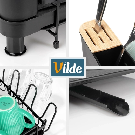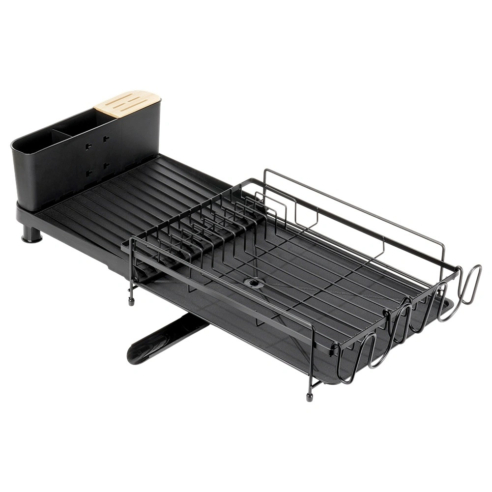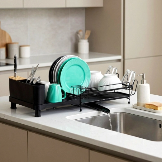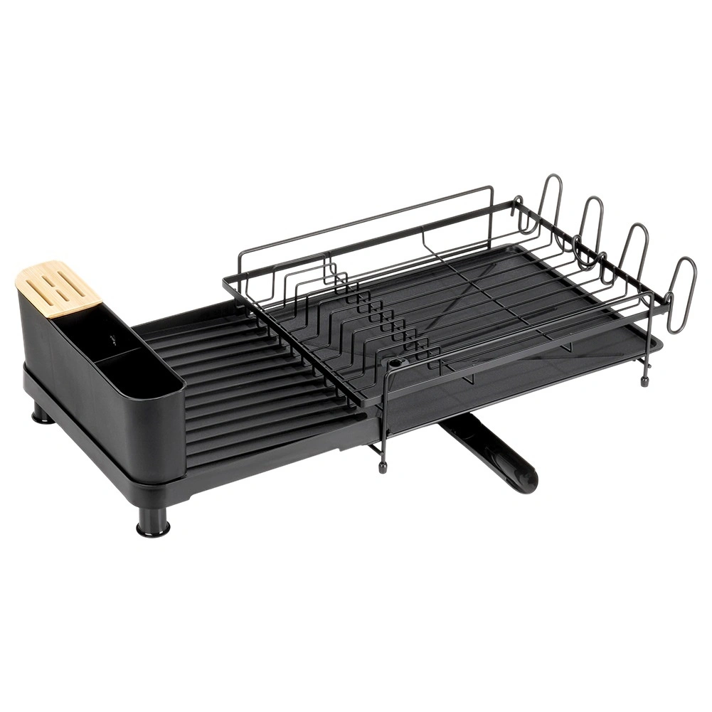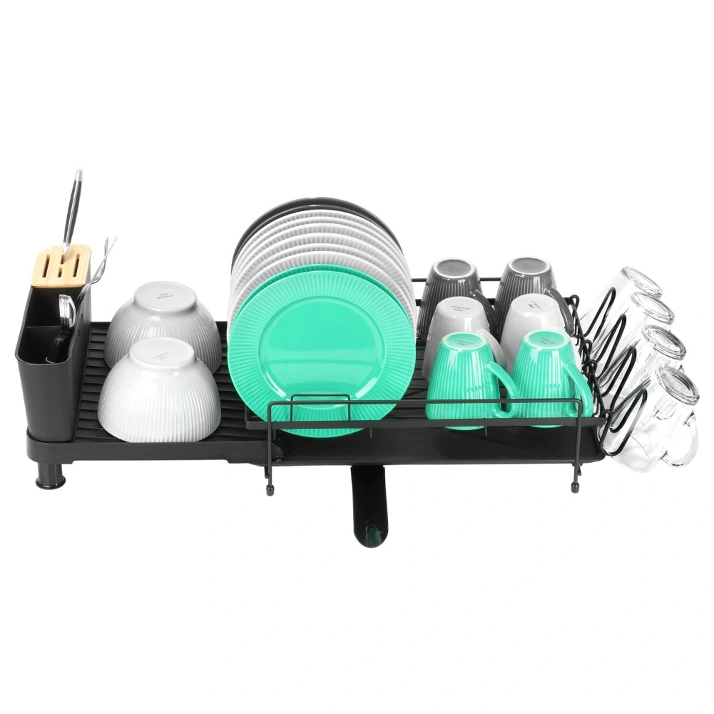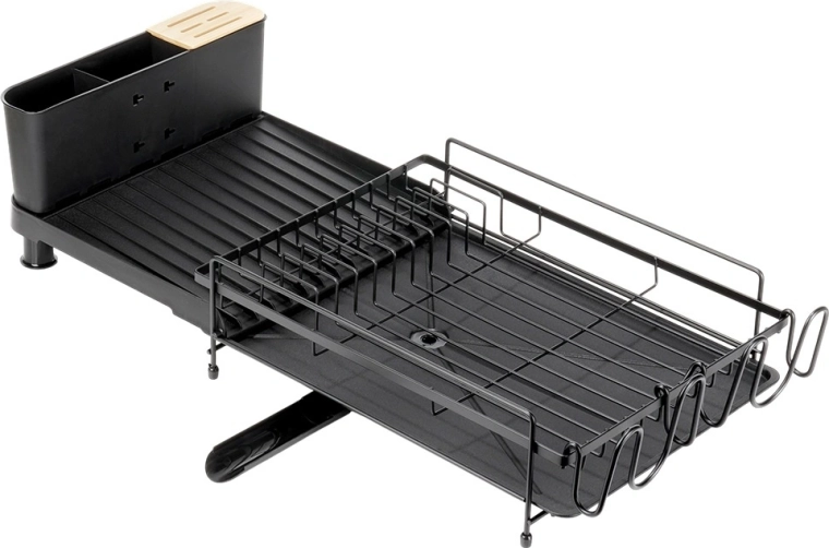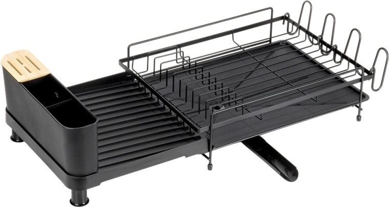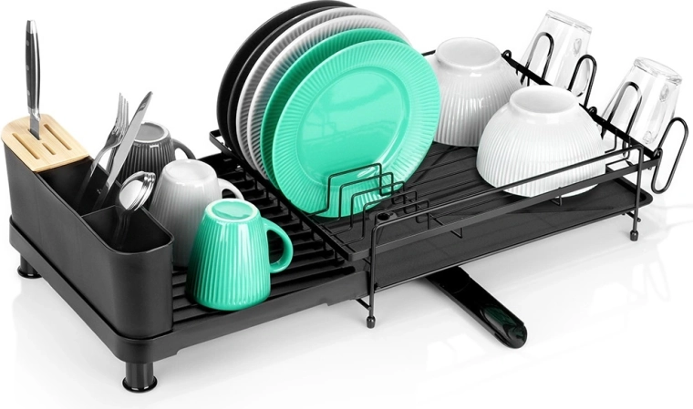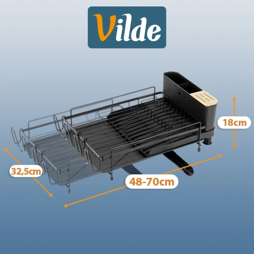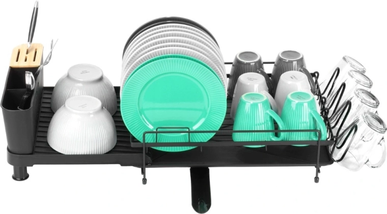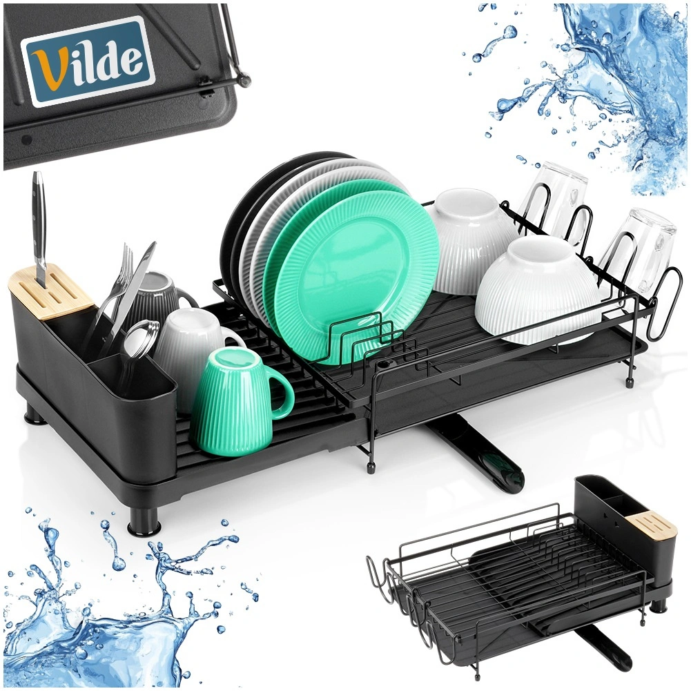 Praktická a stylová odkapávací miska na nádobí s plynule rozsuvnou šířkou 48–70 cm, velkou kapacitou a účinným odvodem vody přímo do dřezu. Pevná kovová konstrukce v černé barvě, vyjímatelná odkapávací tácka a tříkomorový příborník s bambusovým blokem na nože zajistí pořádek, rychlé schnutí a suchou pracovní desku.