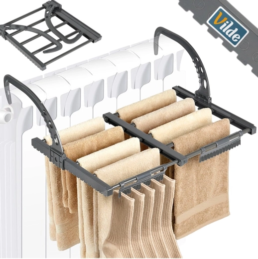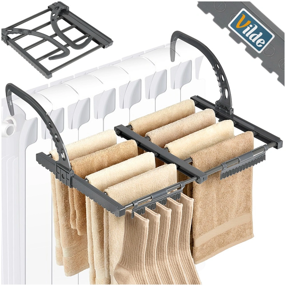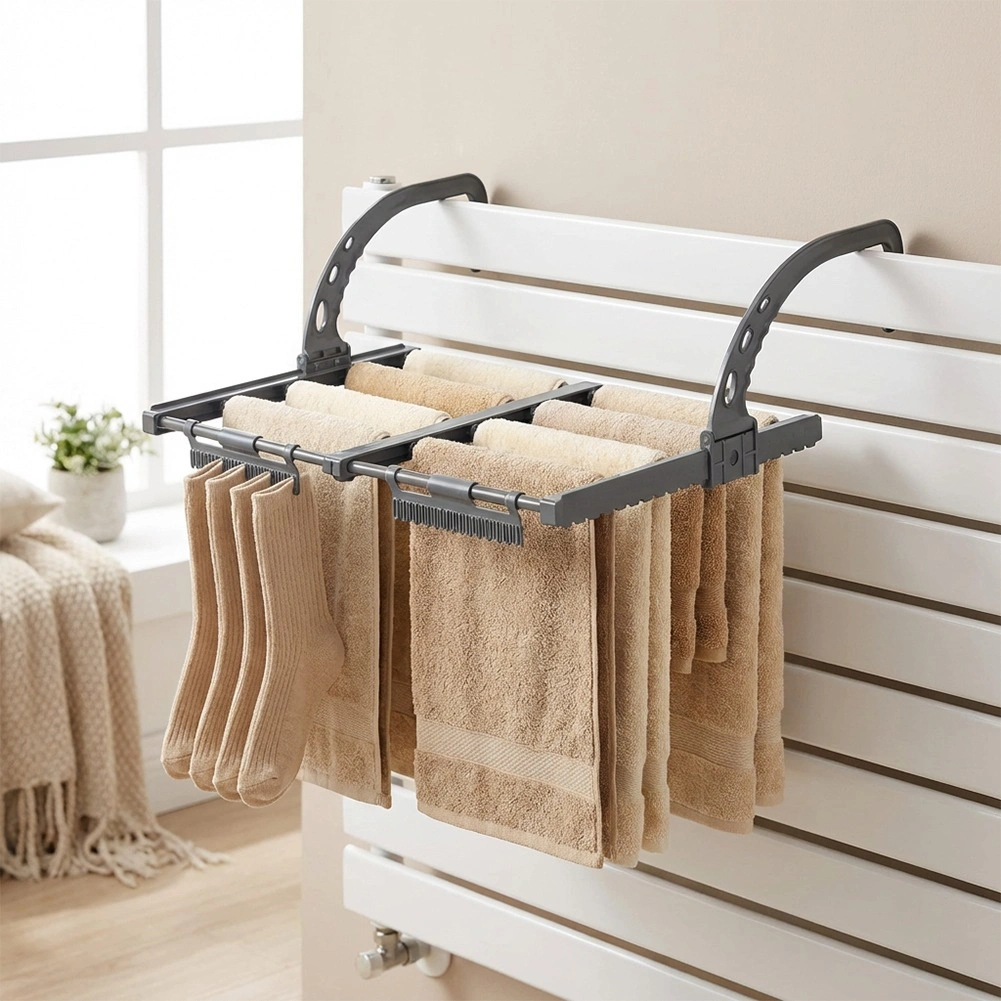 Všestranné použití: na radiátoru v koupelně či pokoji, ale také na zábradlí balkonu nebo terasy. Po složení zabere minimum místa – skvělé řešení do malých domácností i na cesty.