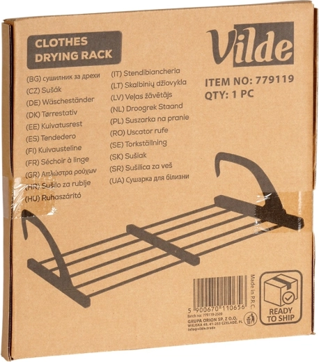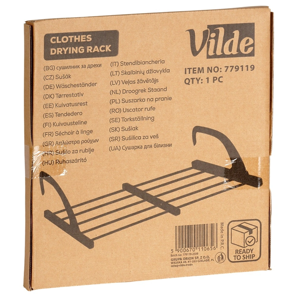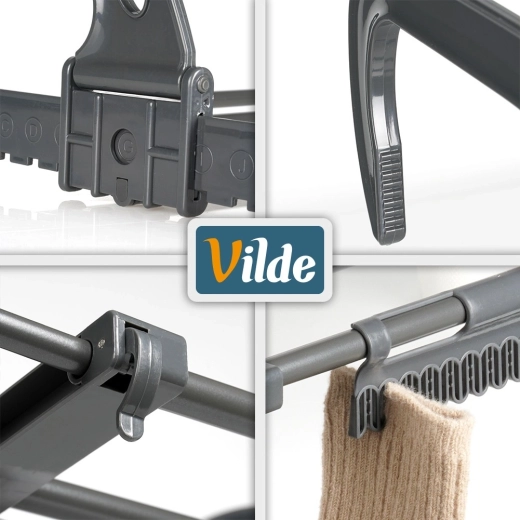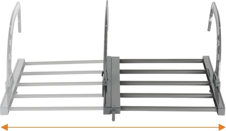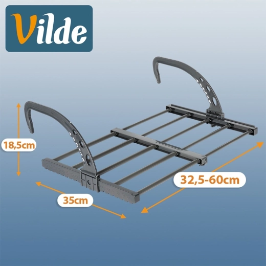 Díky vysouvací konstrukci 32,5–60 cm přizpůsobíte prostor aktuální náloži prádla. Celkem 10 tyčí (délky 26 a 28 cm) poskytuje přibližně 270 cm sušicí plochy – ideální na spodní prádlo, dětské oblečení, trička či ručníky. Dva praktické držáky na drobné kusy usnadní sušení ponožek či spodního prádla.