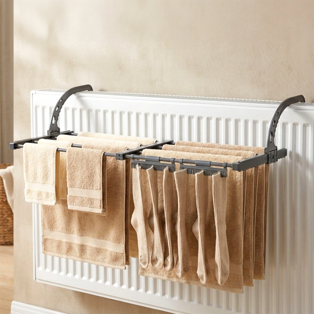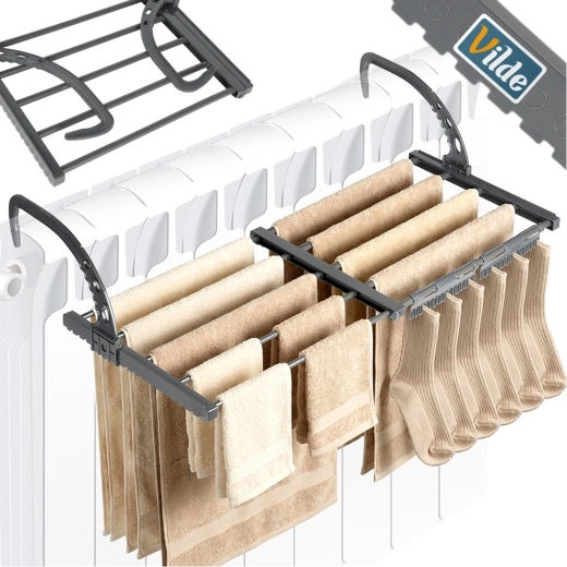 Praktický roztažitelný sušák na radiátor šetří místo a urychluje sušení díky teplu z topení. Nabízí nastavitelnou šířku 45–83 cm, pevnou kovovou konstrukci a skládací háky pro snadnou montáž na různé typy radiátorů či zábradlí. Ideální do malých bytů, koupelen i na balkon.