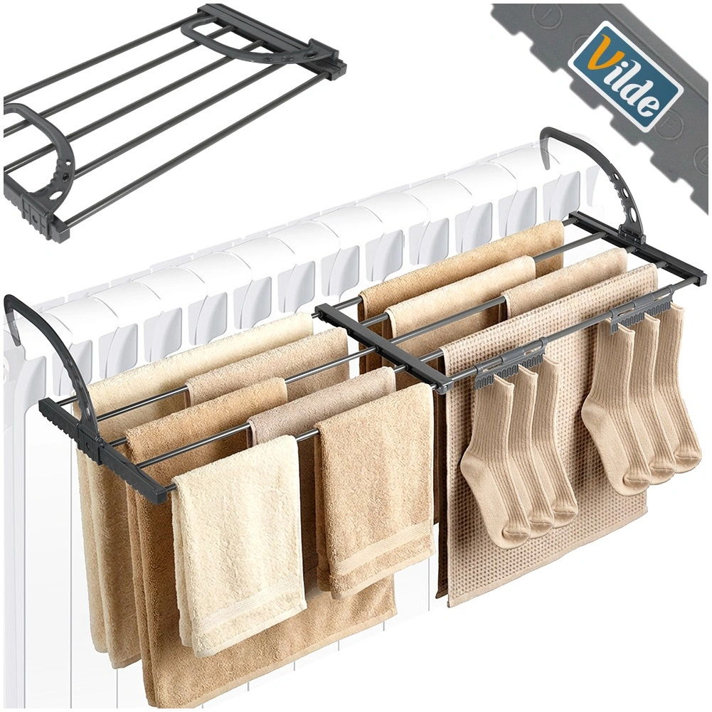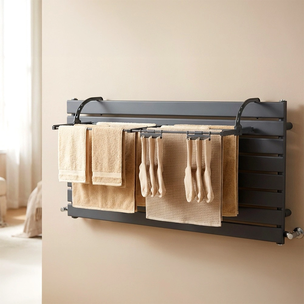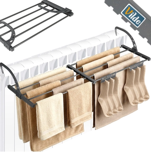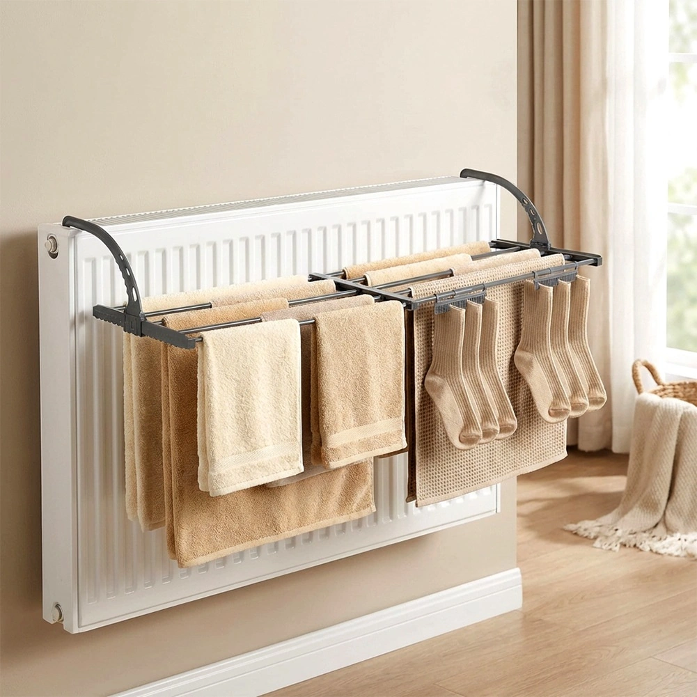 - Úspora místa: montáž na radiátor nebo zábradlí, kompaktní skládací design.
