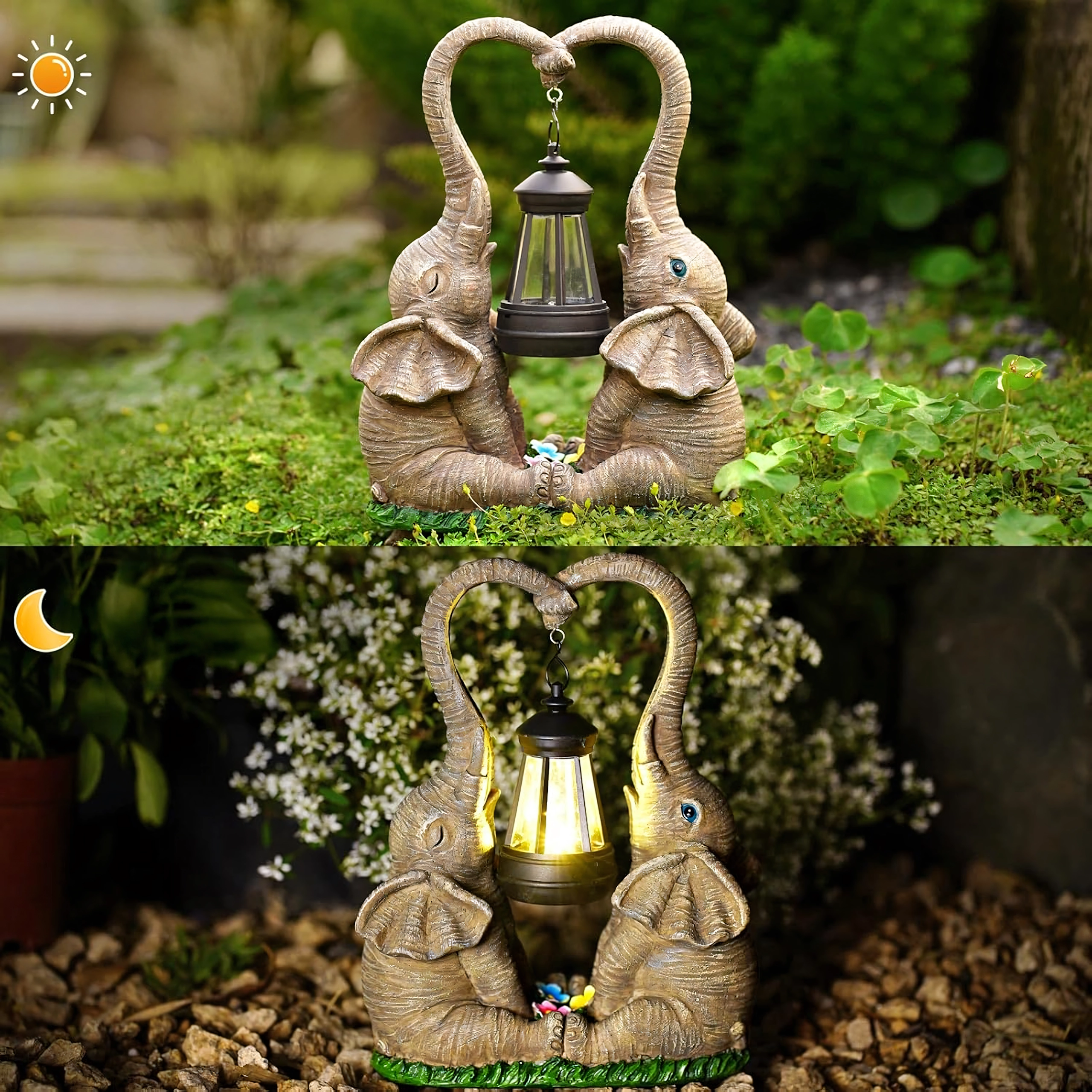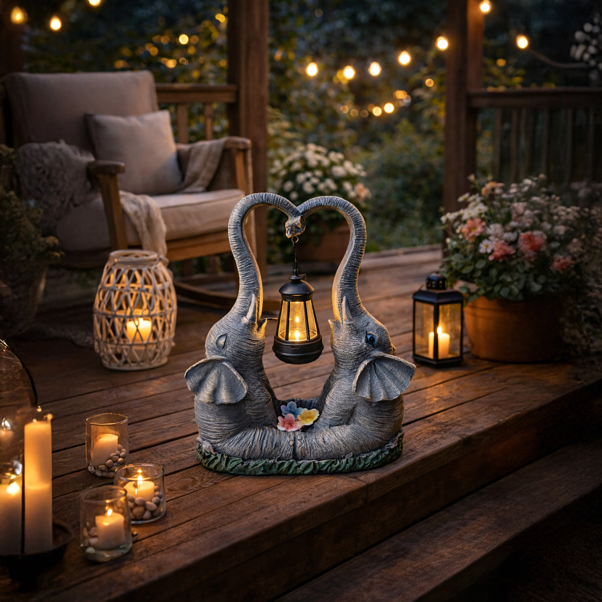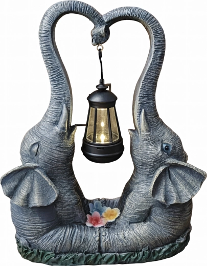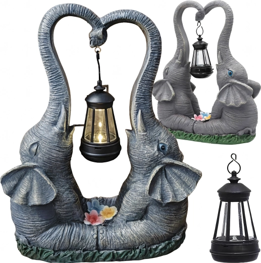 Tato dekorativní lampička v podobě dvou slonů spojuje půvab zahradní sošky a praktické ambientní osvětlení. Lucerna zavěšená mezi choboty vyzařuje teplý nádech světla, který zvýrazní květinové záhony, okenní parapet i zahradní posezení.