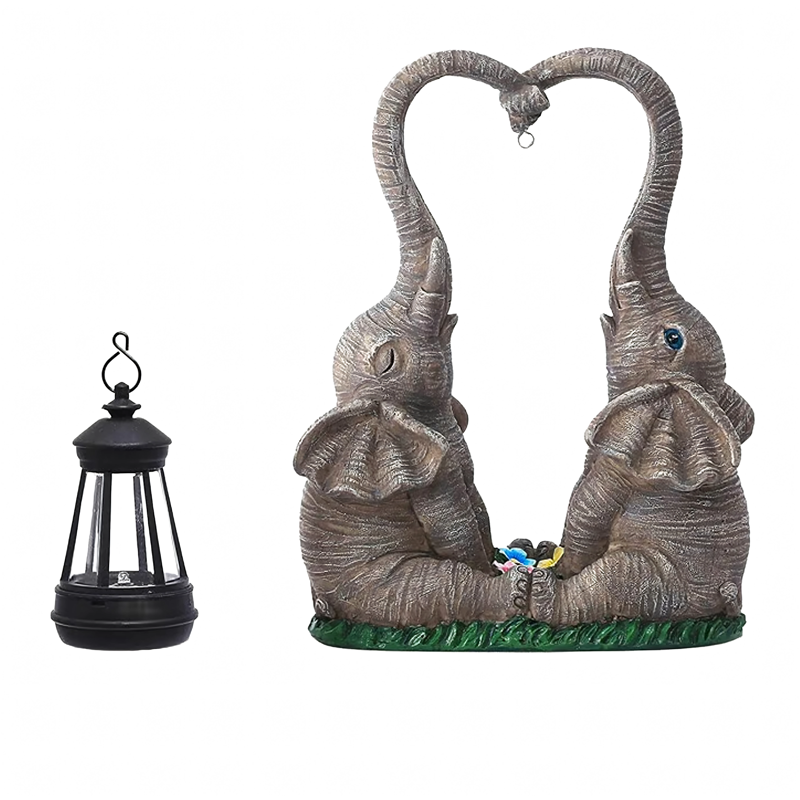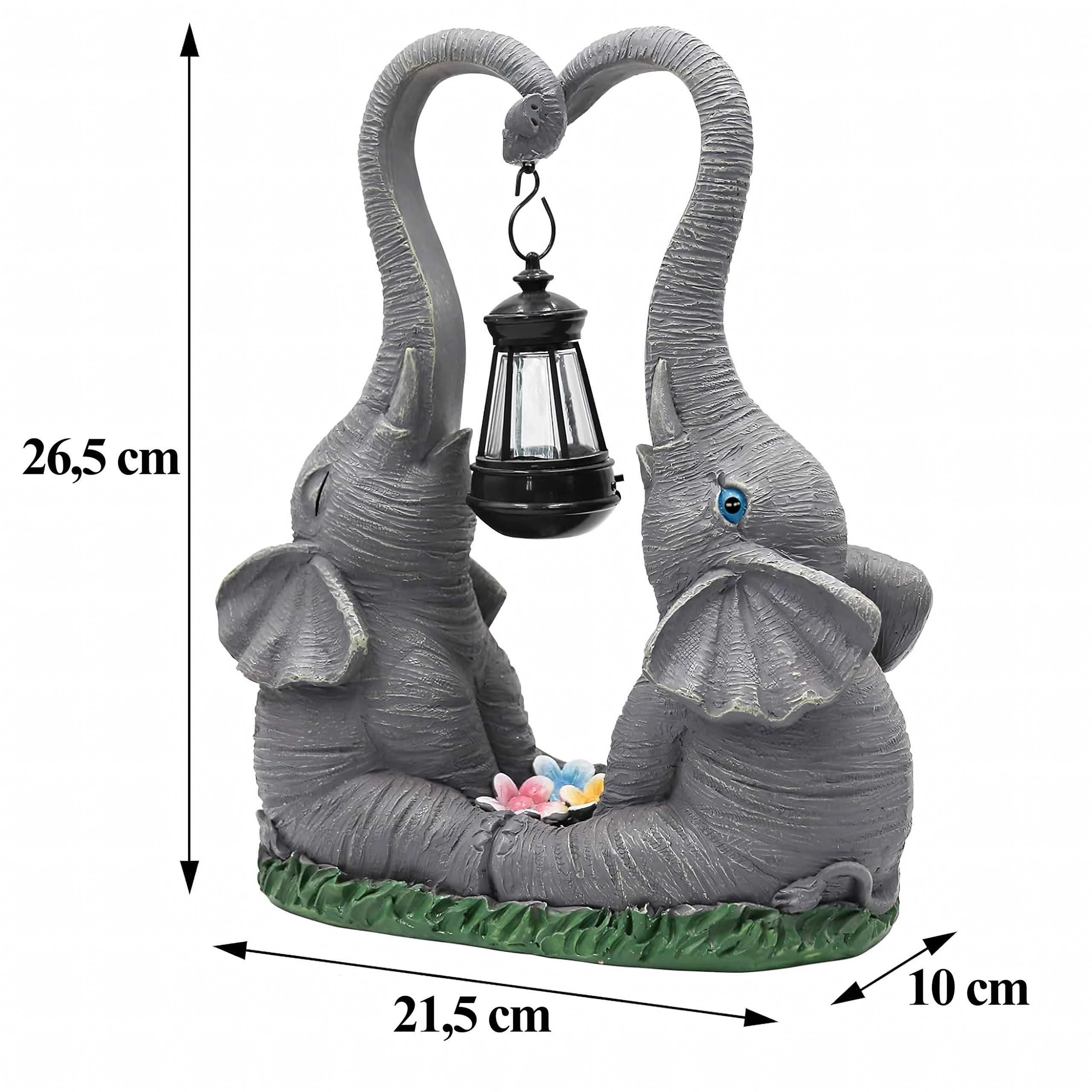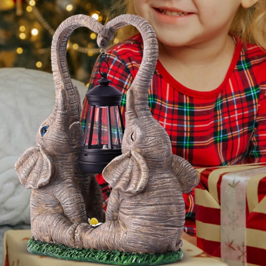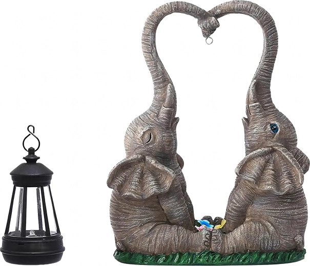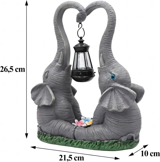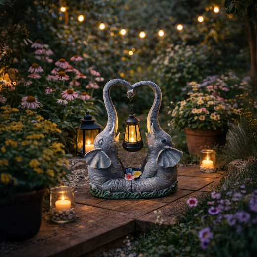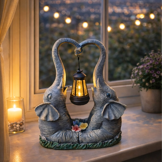 Roztomilá zahradní dekorace se dvěma slony, jejichž choboty tvoří srdce, nese zavěšenou lucernu s teplým LED světlem. Odolná pryskyřičná soška se skvěle hodí na zahradu, terasu i balkon a večer vytvoří příjemnou atmosféru. Ideální jako dárkový doplněk i stylový akcent venkovního osvětlení.