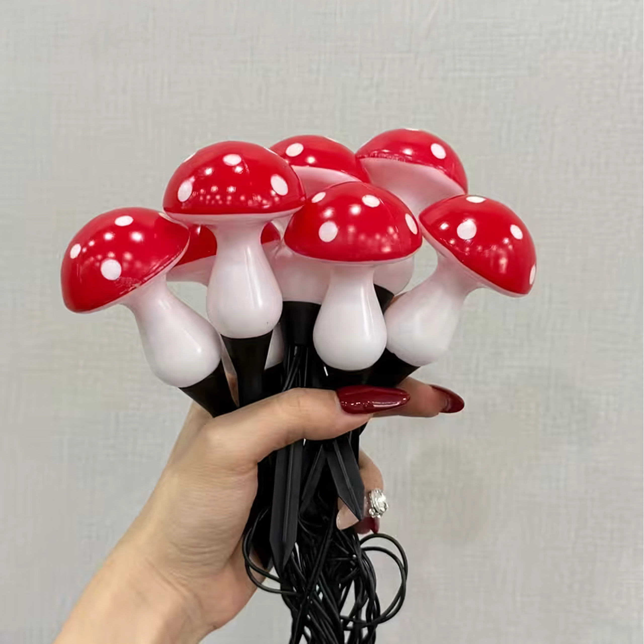 - Kouzelný design: červené kloboučky s bílými tečkami a hřejivý žlutý svit