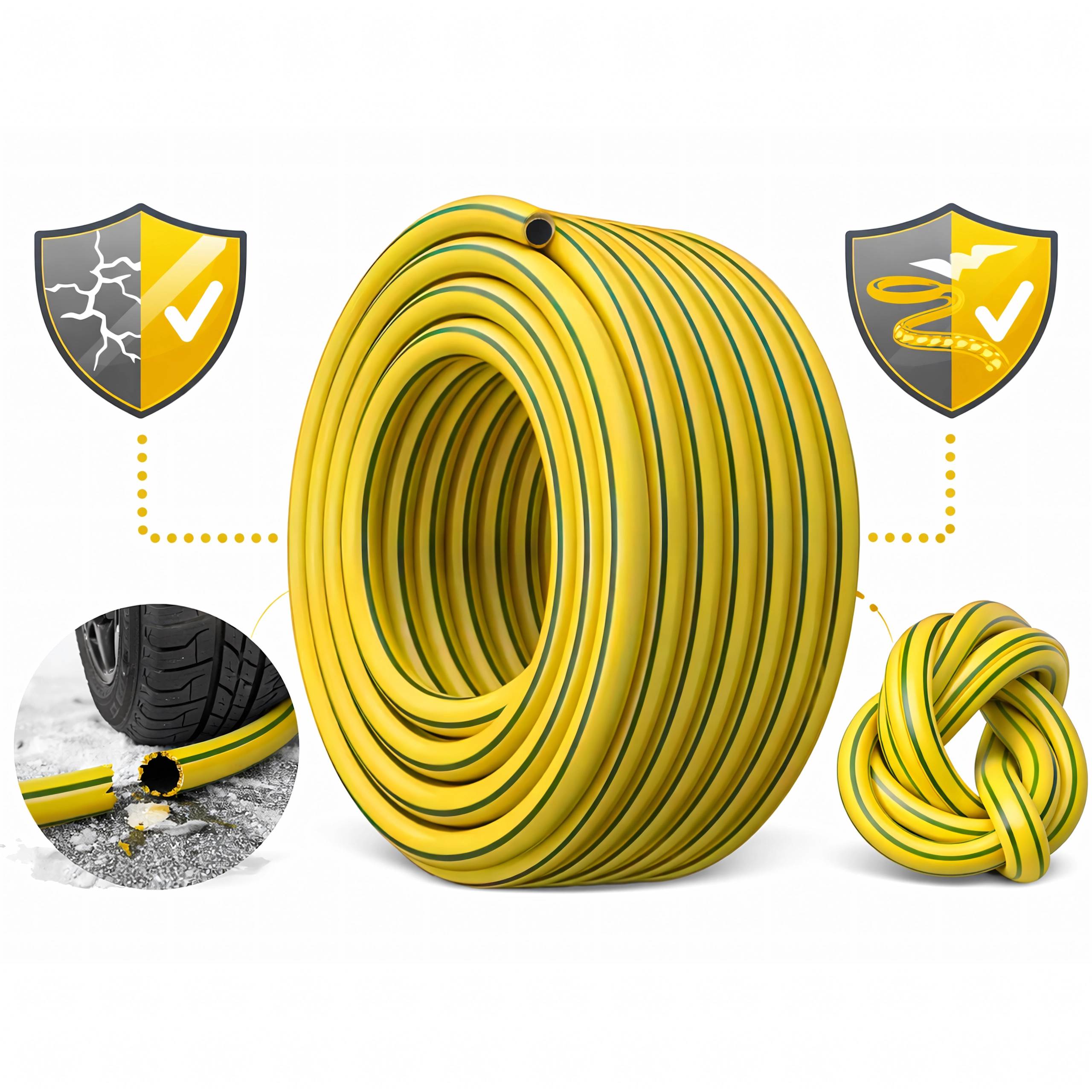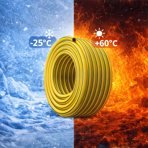 Hadice je kompatibilní s běžnými rychlospojkami 1/2", takže ji bez potíží připojíte k postřikovači, pistoli nebo zahradnímu kohoutu. Jasně žluté provedení zvyšuje viditelnost na trávníku a snižuje riziko poškození při práci.