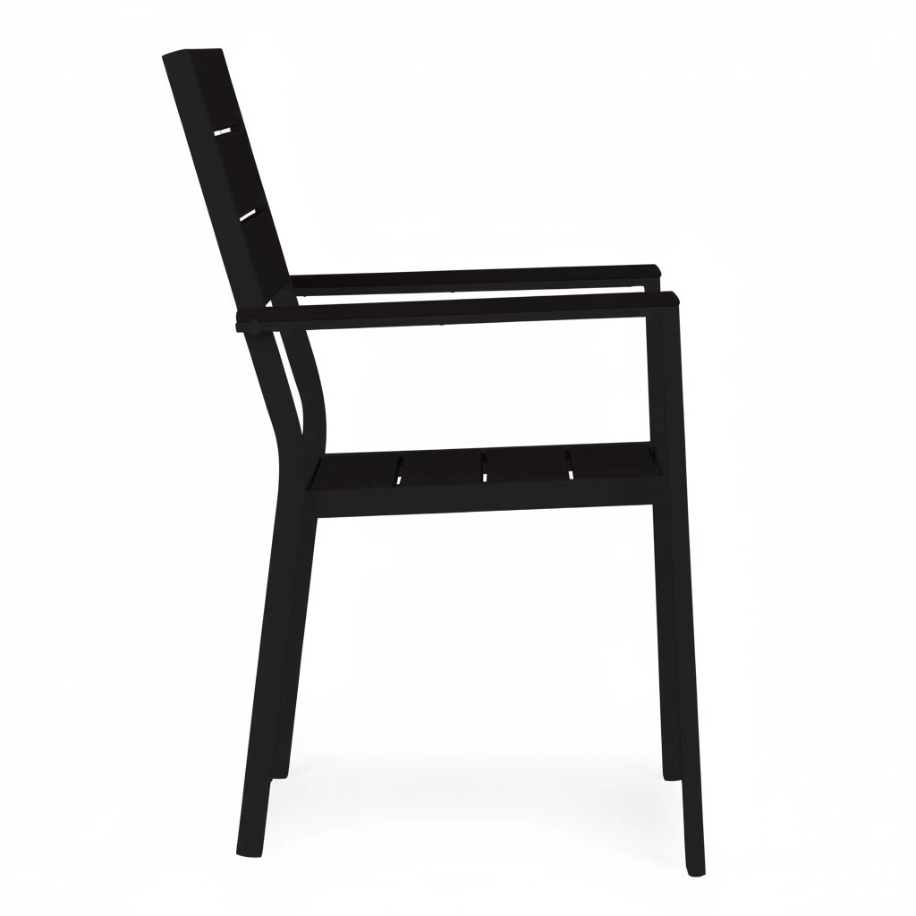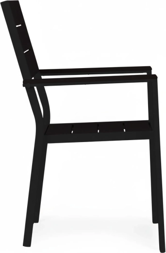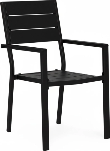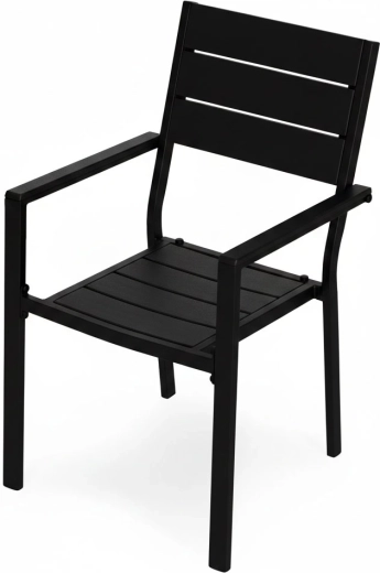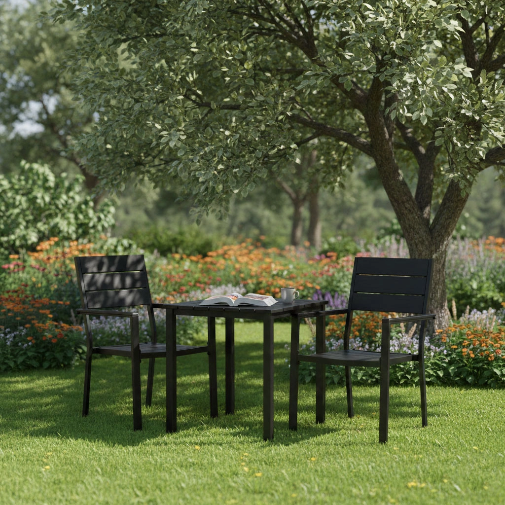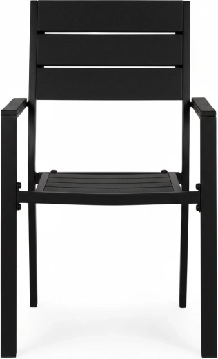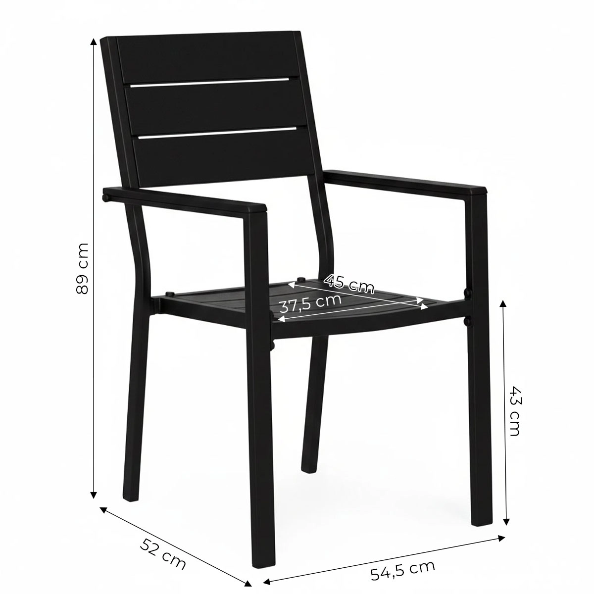Rám z práškově lakované oceli zajišťuje vysokou pevnost a odolnost proti korozi, zatímco sedák a opěrka z trvanlivého HDPE se vyznačují texturou inspirovanou dřevem a snadnou údržbou. Konstrukce je stabilní a navržená pro proměnlivé venkovní podmínky.
