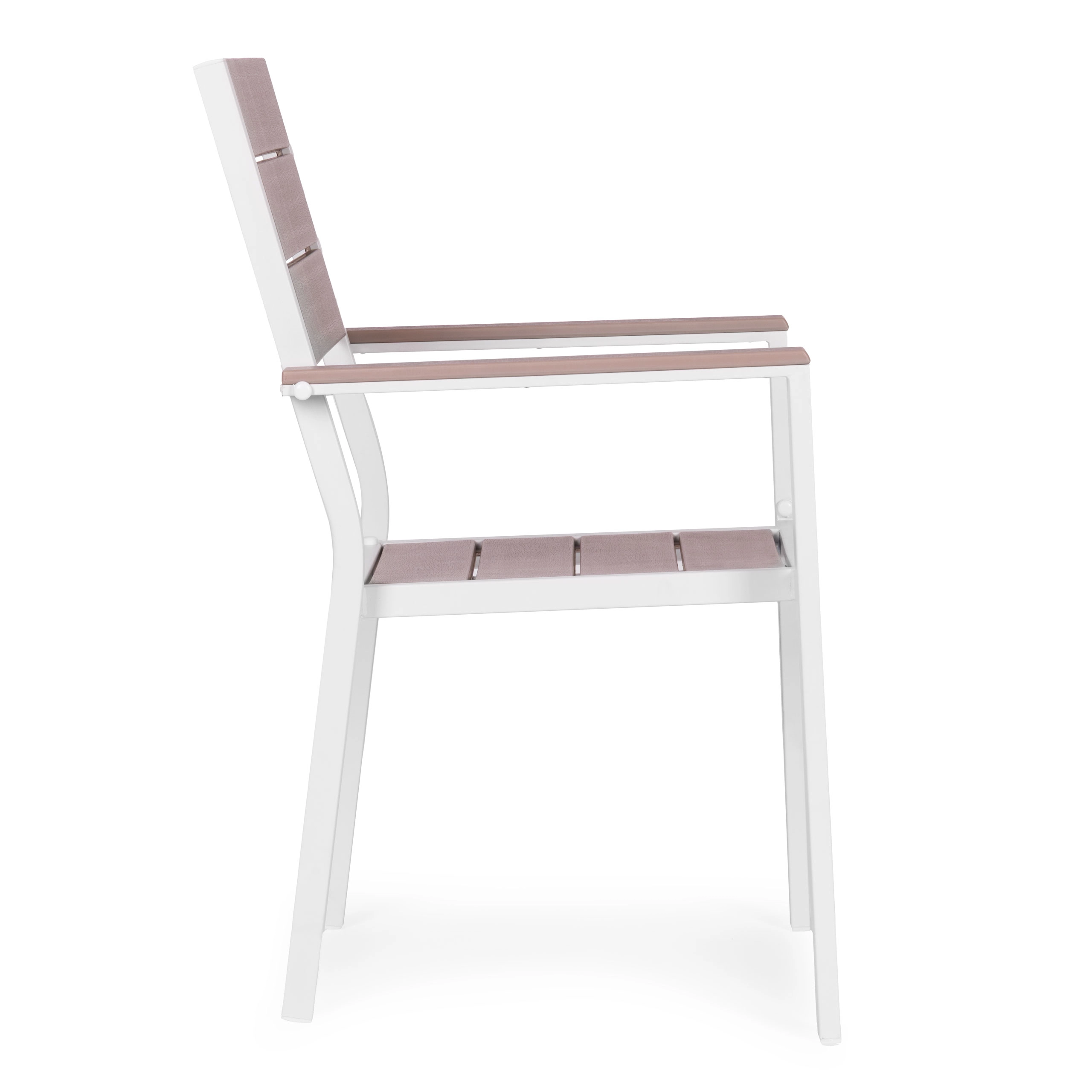 Konstrukce z práškově lakované oceli zajišťuje vysokou odolnost proti korozi a stabilitu, zatímco HDPE panely se vzhledem dřeva jsou pevné, rychle schnou a snadno se čistí. Širší sedák a područky přidávají na komfortu i při delším sezení.