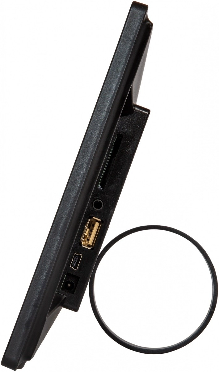 Konektivitu zajišťuje USB 2.0 a univerzální čtečka karet (SD/SDHC/XD/MMC/MS). Vestavěný reproduktor 2 W se postará o zvuk, a pro soukromý poslech je k dispozici sluchátkový výstup. Zařízení můžete postavit na stůl nebo zavěsit na stěnu – ideální i pro nenápadnou prezentaci v obchodech či recepcích.