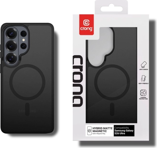 Prémiové pouzdro CRONG Hybrid Matte Magnetic pro Samsung Galaxy S26 Ultra nabízí maximální ochranu, plnou kompatibilitu s MagSafe a elegantní matný design. Díky 30 silným magnetům N52, zesíleným rohům a zvýšeným okrajům kolem displeje i fotoaparátu chrání telefon před pády, škrábanci a nečistotami, zároveň zachovává vynikající odezvu tlačítek a pohodlné každodenní používání.