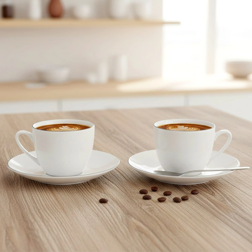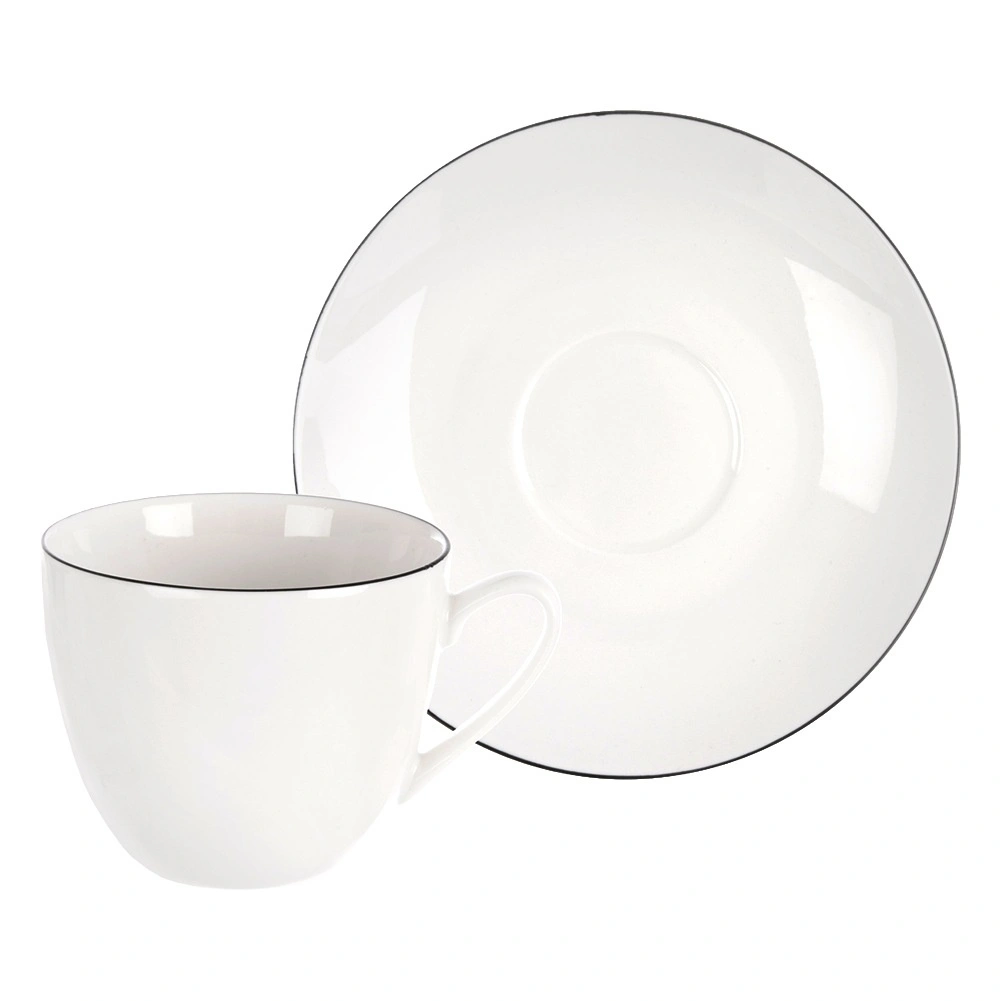 Bílý porcelán s tenkou tmavou obrubou se hodí do moderních i klasických interiérů a zvýrazní servírování kávy i čaje.