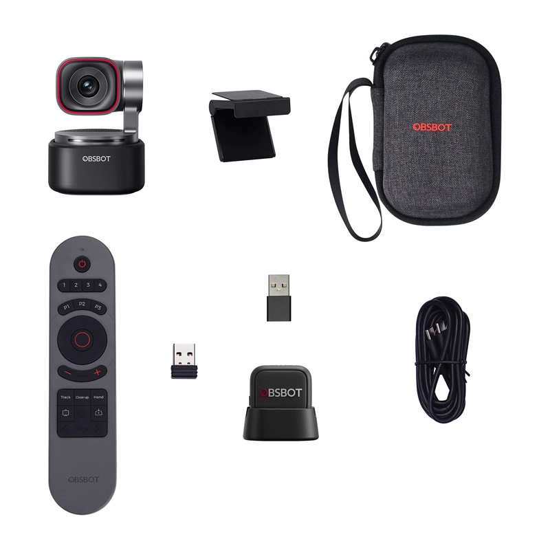 - Webová kamera OBSBOT Tiny 3; OBSBOT Tiny Smart Remote 2; Mikrofon OBSBOT Vox SE; Nastavitelný držák; Kabel USB-C–USB-C; Adaptér USB-C–USB-A; Pouzdro