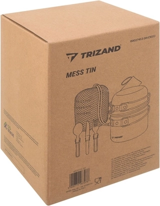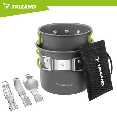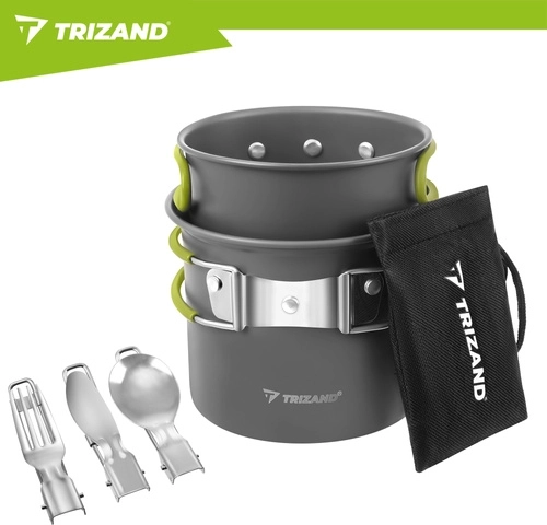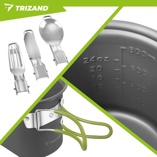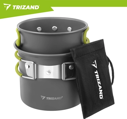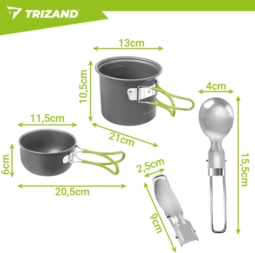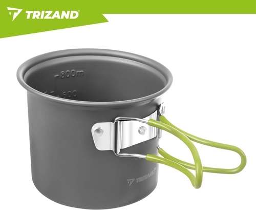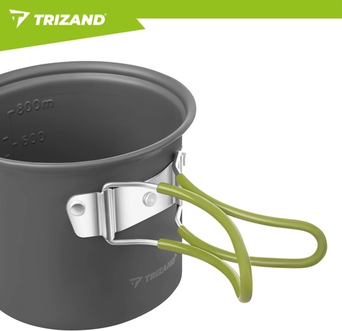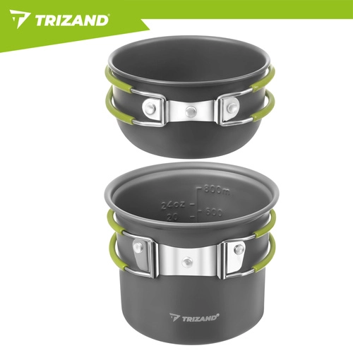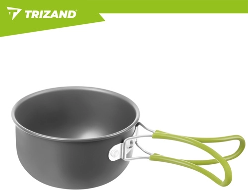 Praktická sada nádobí TRIZAND je vyrobená z odolné hliníkové slitiny (tloušťka 0,8 mm) pro efektivní vaření v přírodě. Kompaktní rozměry hrnce a misky/pánvičky s víkem šetří místo v batohu, zatímco skládací ergonomické rukojeti s jistícím mechanismem zajišťují bezpečný úchop bez rizika popálení.
