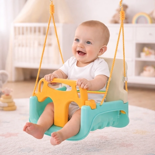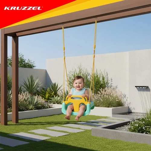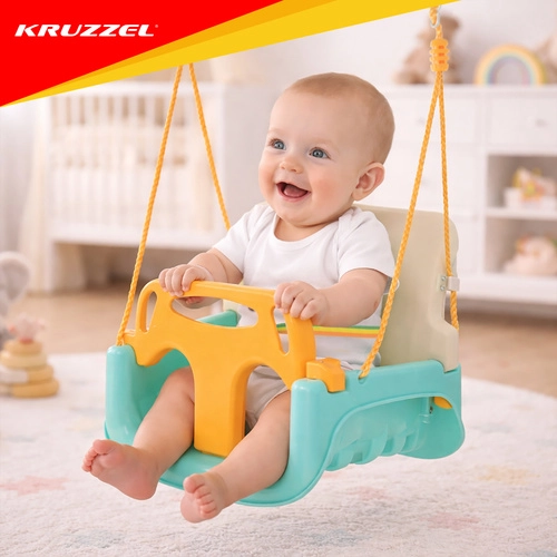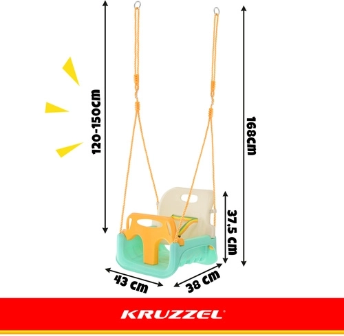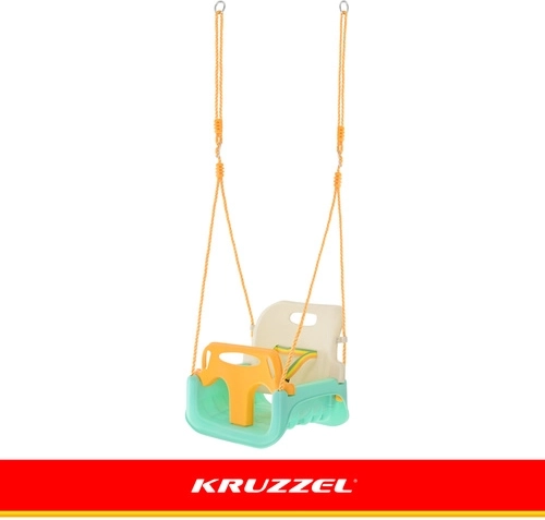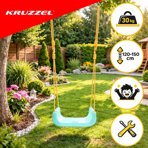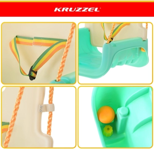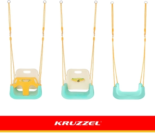Univerzální dětská houpačka 3v1 KR UZZEL se přizpůsobí růstu dítěte – od miminka až po předškoláka. Nabízí odnímatelnou přední zábranu a opěrku, bezpečnostní pás, nastavitelná lana (120–150 cm) a nosnost 30 kg. Odolná plastová konstrukce je vhodná do interiéru i exteriéru a poskytuje bezpečné a pohodlné houpání každý den.