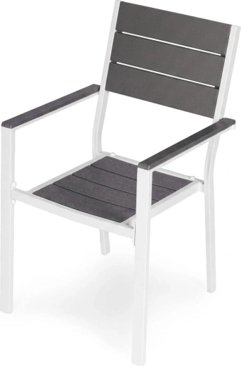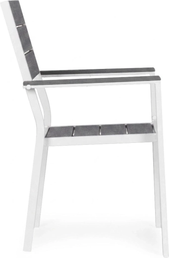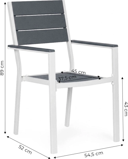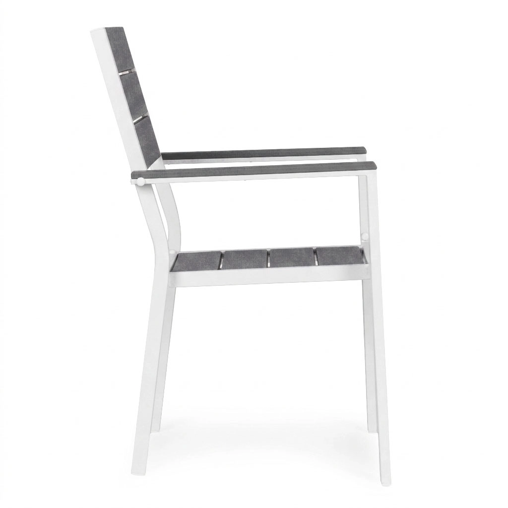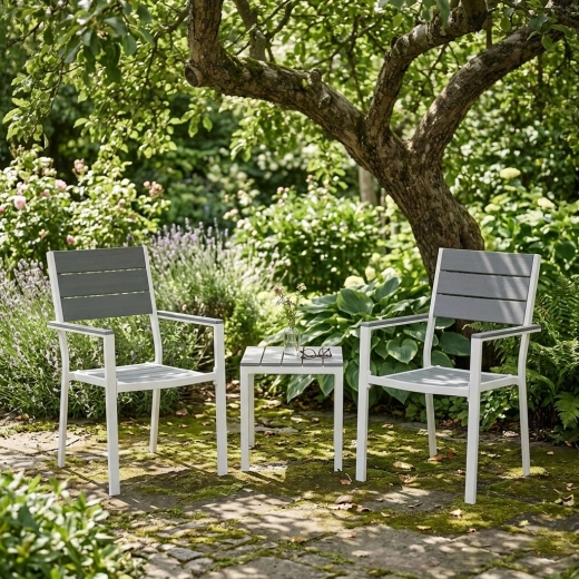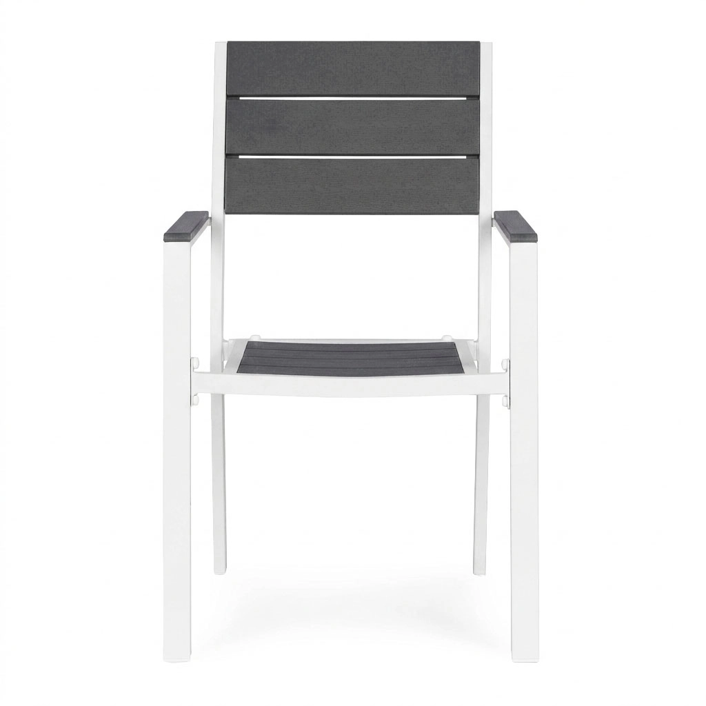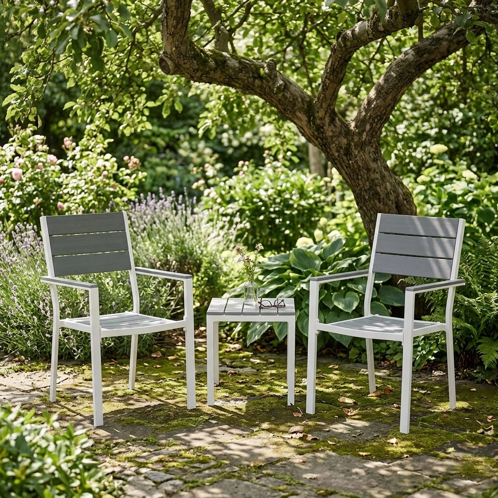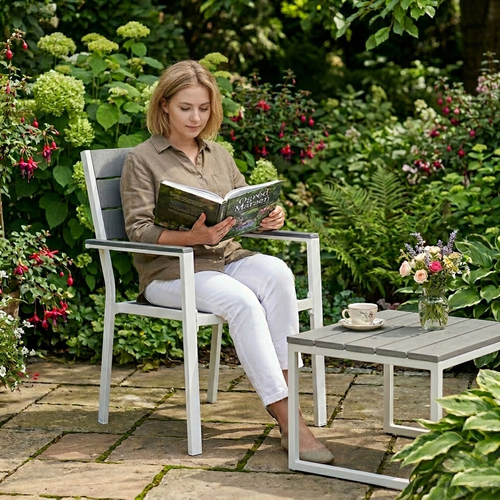 Práškově lakovaný ocelový rám poskytuje vysokou odolnost proti korozi, zatímco HDPE výplně jsou lehké, pevné a snadno se čistí. Materiály zvládají vlhkost i teplotní výkyvy, takže se křesla skvěle hodí pro celosezónní použití na terase i v zahradě.