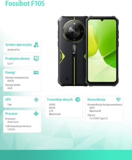 Objevte odolný smartphone Fossibot F105 se zelenými akcenty, který kombinuje robustní konstrukci, víceobjektivový fotoaparát a velký displej s kapkovým výřezem. Díky zesíleným rohům, jistému úchopu a odolnému tělu je ideální do náročných podmínek, přitom nabízí plynulou práci v aplikacích a kvalitní snímky.
